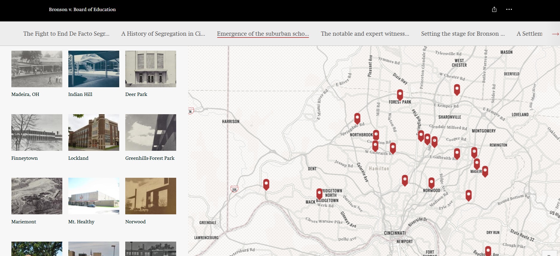 Created through the use of ArcGIS StoryMaps, this new digital exhibition curated by Catherine Cubera, Christopher Harter and Julianna Witt gives users the opportunity to learn more about the collection virtually. StoryMaps, a story-authoring platform, allows for an interactive and engaging experience for users, combining digital narrative capabilities of platforms like WordPress or Omeka, but with additional features such as embedded timelines and dynamic, customizable maps. These capabilities made StoryMaps an ideal platform for bringing the Bronson exhibit to life. For example, by using this technology, we were able to design an interactive map that uses embedded cartographic points to highlight the nineteen suburban Cincinnati school districts involved in the Bronson court case, helping to create spatial context and greater meaning for users as they make their way through the digital exhibit.