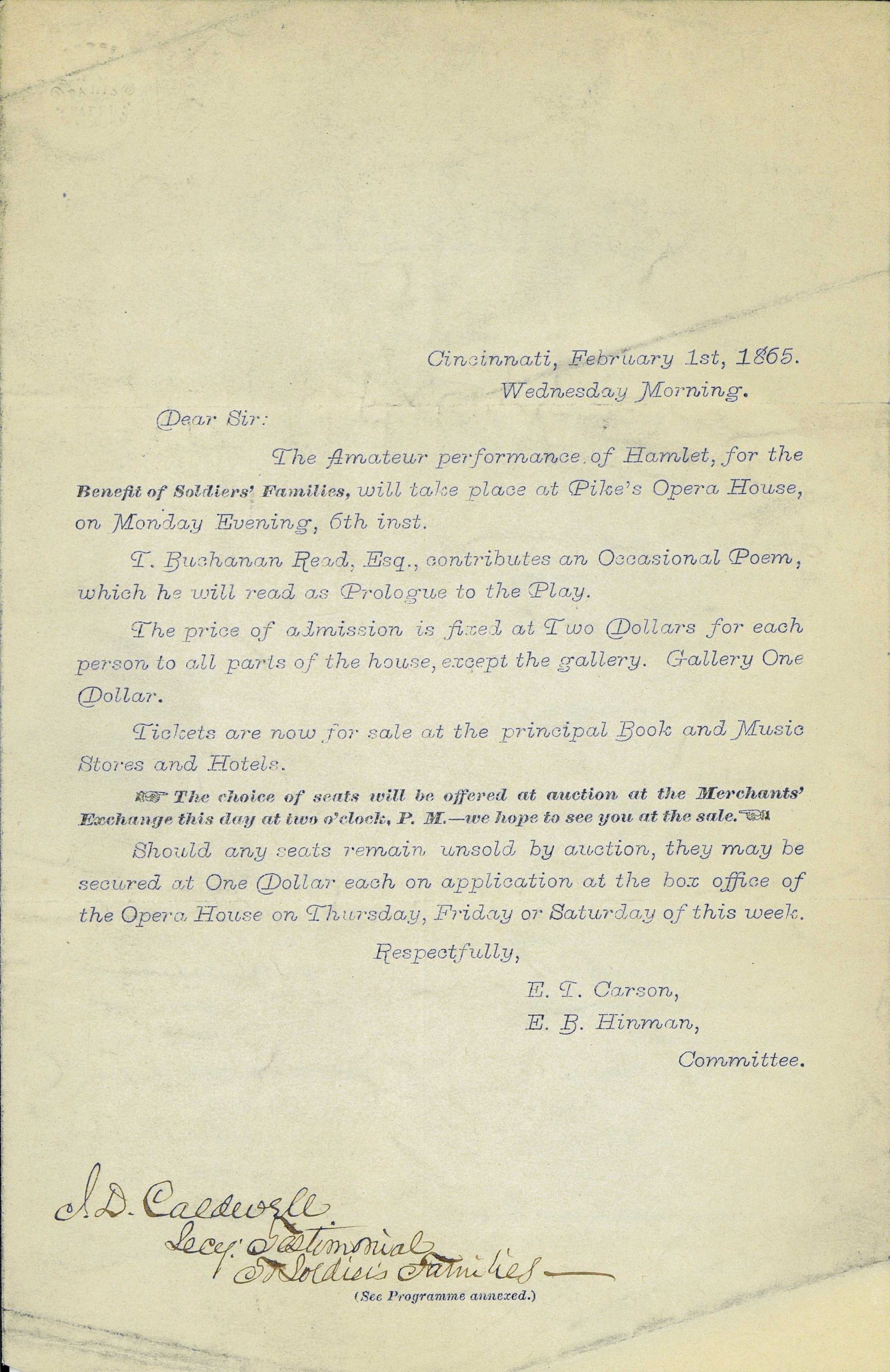 Caldwell’s papers make up 34 archival boxes and 2 oversize boxes (17.85 linear feet) and are arranged into series by topic. This treasure trove of material includes items such as Caldwell’s handwritten notes, lists of early businesses, Cincinnati theater histories, early Cincinnati newspapers, original land warrants, Cincinnati settlement histories, Civil War correspondence and early church service programs.