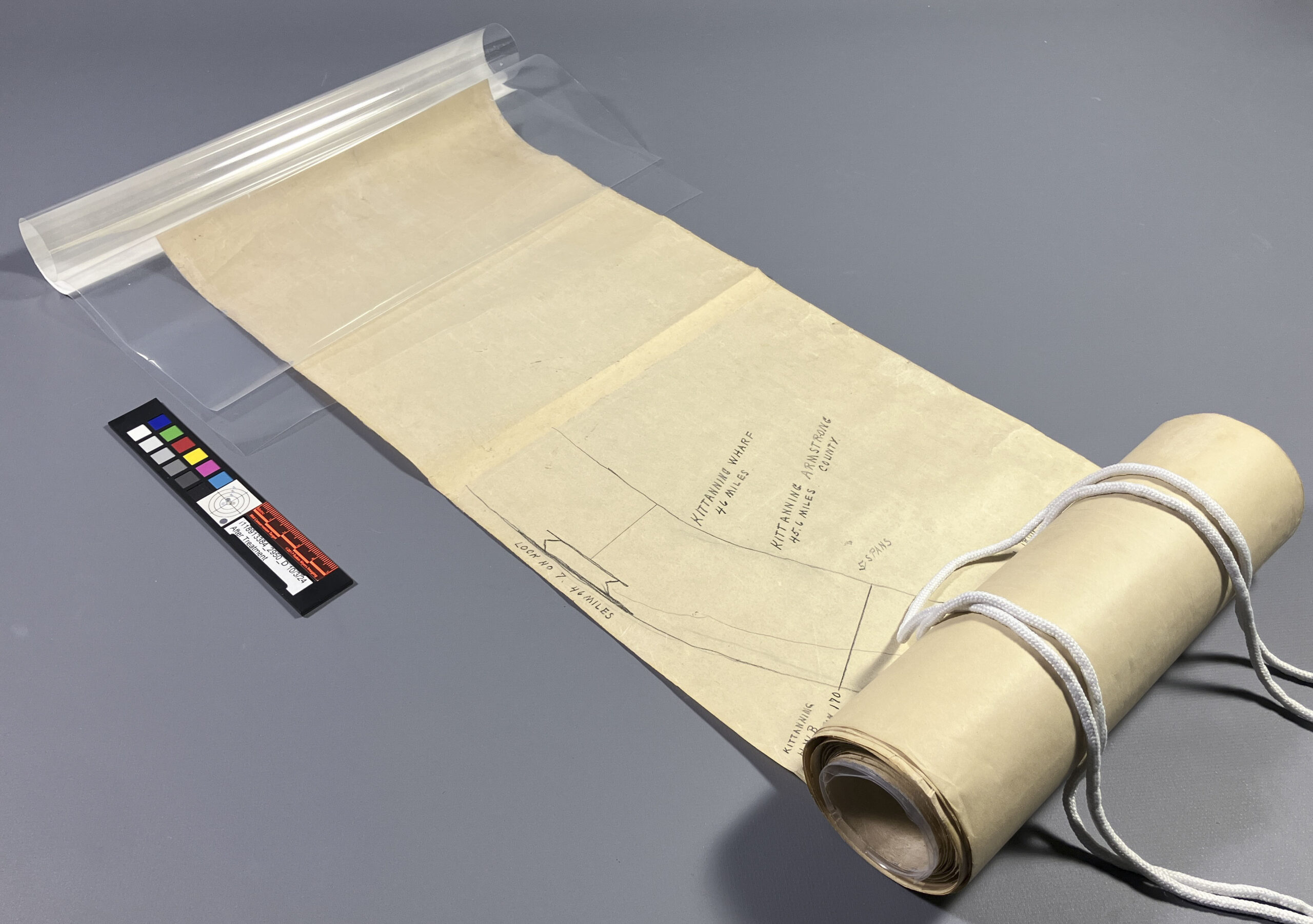 Back in October of 2024, we received something slightly more unusual from the Cincinnati and Hamilton County Public Library, a 15-foot-long, hand-drawn rolled map of the Allegheny River. Yes, fifteen feet.  This map was created by joining smaller sheets edge-to-edge, forming one continuous scroll that looked more like a treasure map than your typical library item.