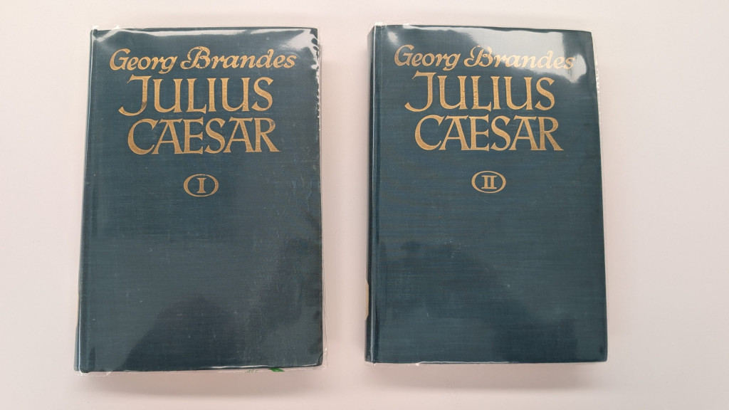 Sometimes, a book just outrightly tells its story through notes left by previous owners. A handwritten message about where it was bought, a book plate of whose library it came from, or an inscription with notable information about damage to the tome are all ways prior owners can document what the book has been through. This latter suggestion is the case for a two-volume set of Cajus Julius Caesar by Georg Brandes.