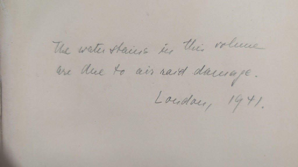 These books were published in 1925 by the Erich Reiss Verlag publishing house. On the fly leaf of both of these volumes is a handwritten inscription which reads “The water stains in this volume are due to air raid damage. London, 1941.” In graphite. What a big journey for two books, from Berlin, Germany, to London, England, and then to Cincinnati, Ohio!