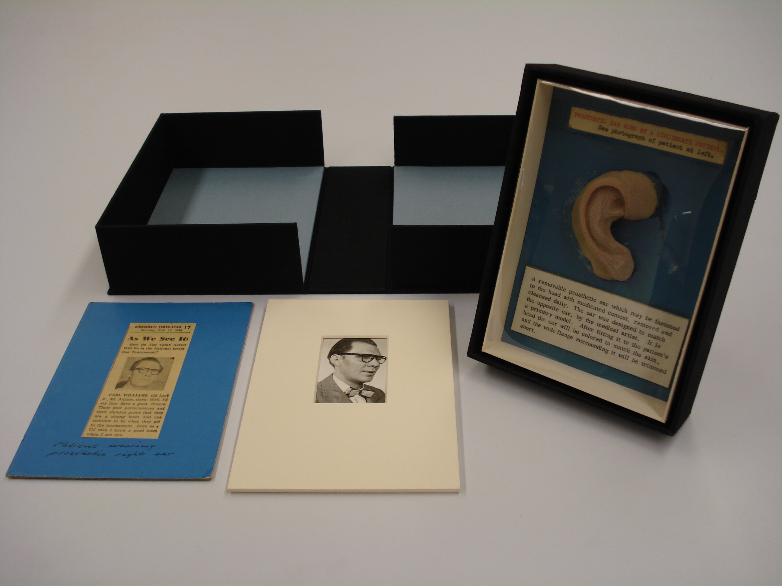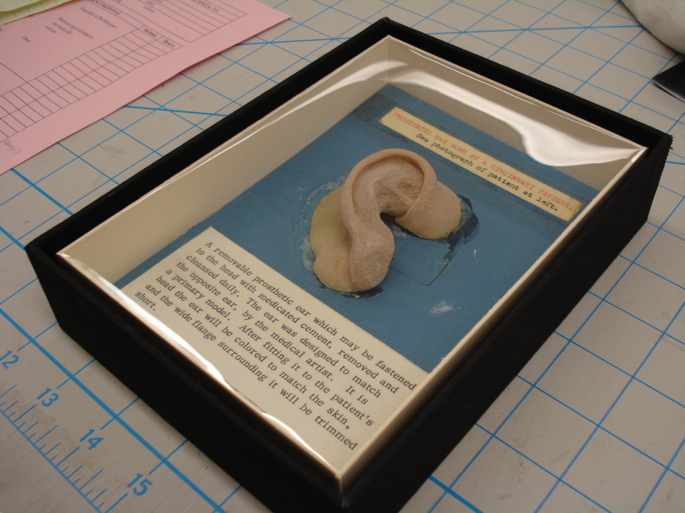 Recently we received an unusual item from the University of Cincinnati’s Winkler Center for the History of the Health Professions:  a prosthetic ear dating to the mid 1950’s accompanied by a small photograph and newspaper clipping depicting the patient modeling the false ear.  Fortunately, or unfortunately depending on your point of view, the ear we received in the lab was a primary model used to construct the actual prosthetic, so it would not have been worn regularly by the patient.  I have to admit this is one of the more gruesome items I’ve come across in a conservation lab.  Not because it’s a prosthetic ear, but more so because improper housing and storage conditions led to deterioration which gave the ear a very bumpy almost wart-like surface appearance…and it looks so real…