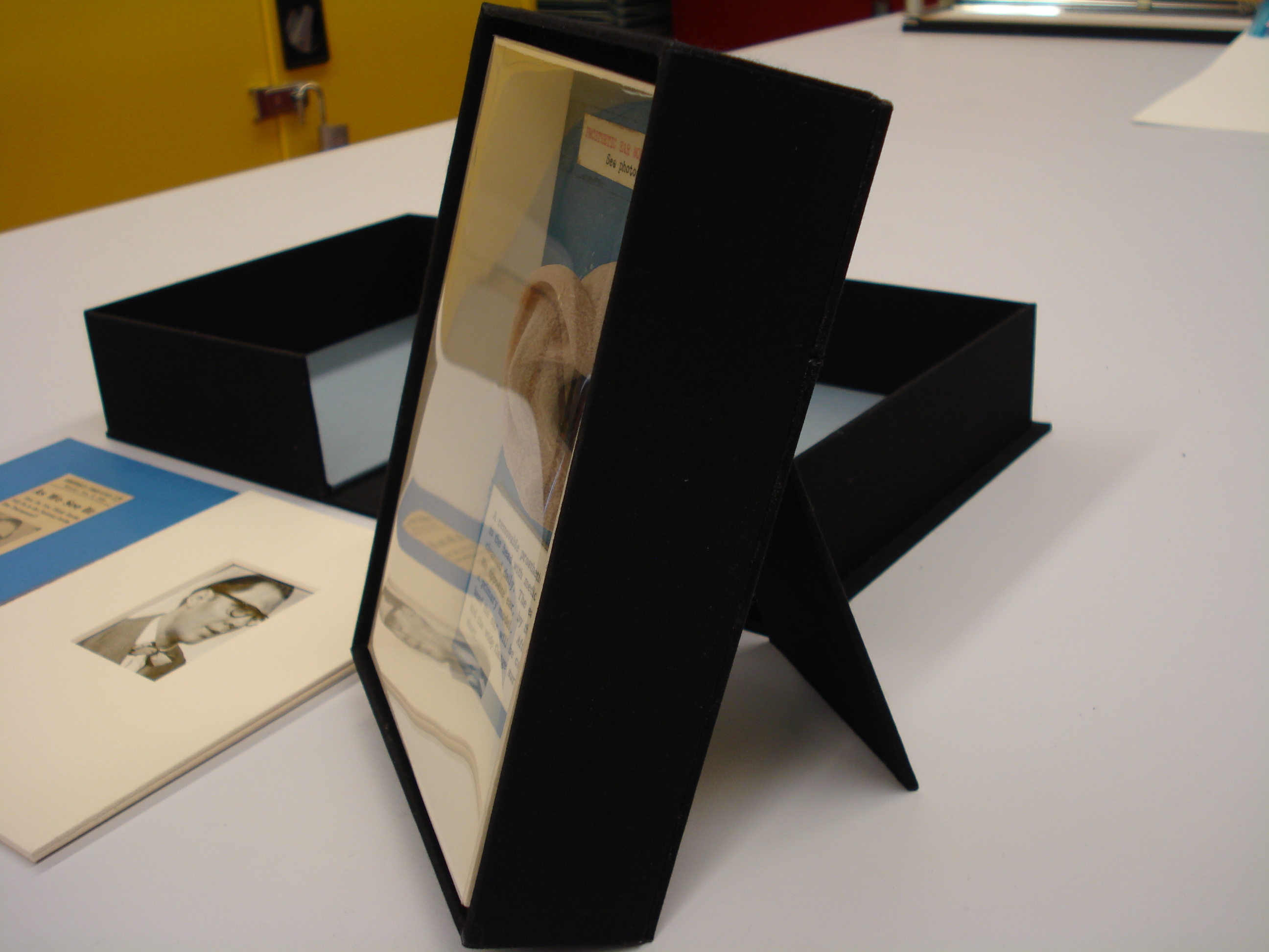 The secondary cloth-covered tray was constructed with a built-in easel back to serve as a means of display.  There is a gap around the border of the mat board tray to facilitate off-gassing.