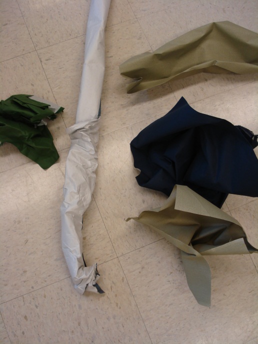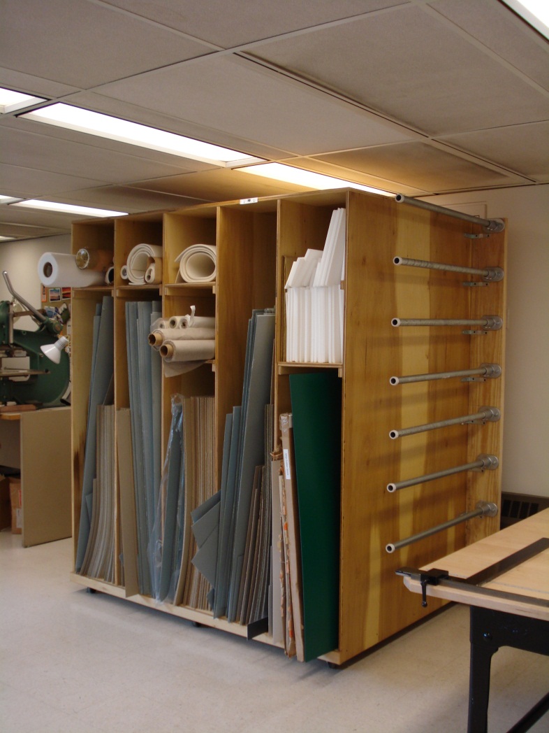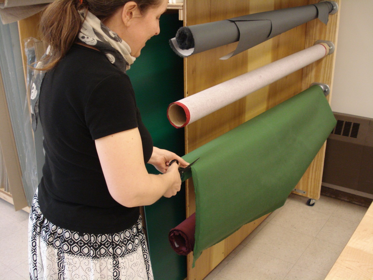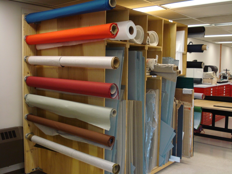 This was not ideal for several reasons; mainly it couldn’t adequately hold all of our cloth and it was difficult to remove a spool of cloth without ramming it into the ceiling tiles. Also, there were occasionally cloth/buckram casualties…
