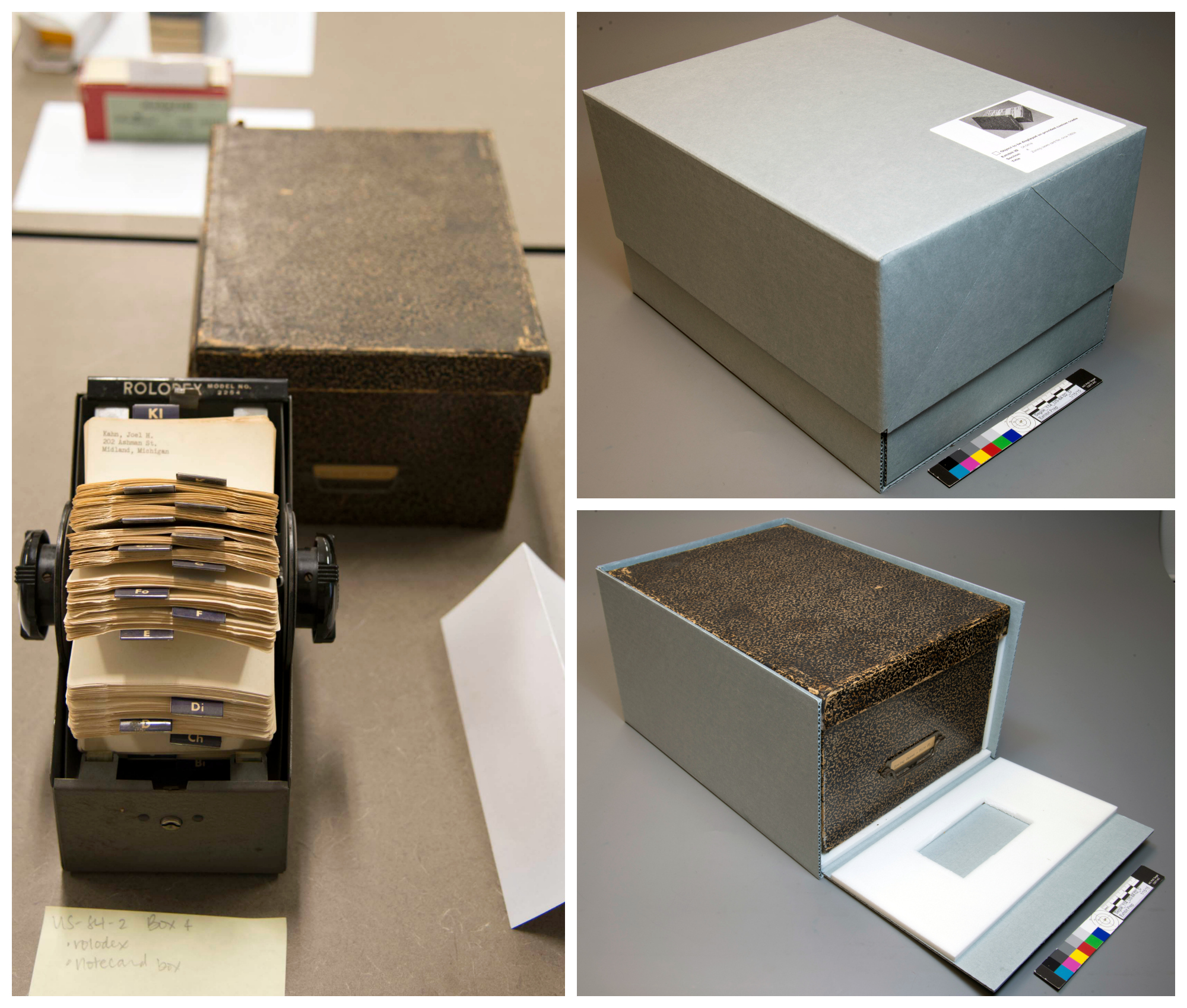Because of their size and weight a file box and a Rolodex required custom banker-style boxes with a drop-down side.