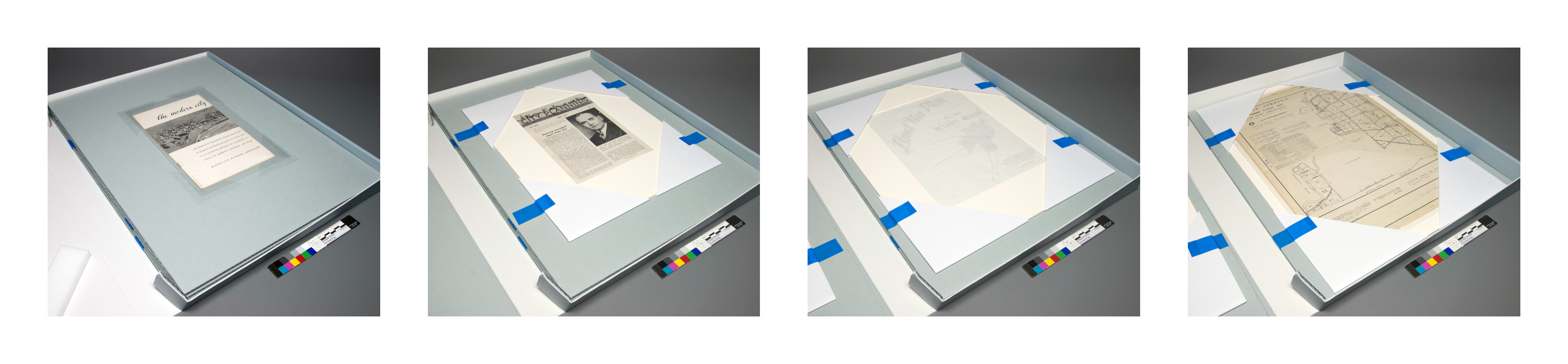 Then there were the diplomas and awards, passports, plaques, sketches, photographs, postcards, and maps. Some were placed in mylar L-sleeves, some were mounted and matted and a few of those were also placed in a corrugated board portfolio. In many cases several of these were housed in a single box, the largest on the bottom and smallest on the top, each one attached to a sheet of corrugated board with either polypropylene or easy to release folded paper and painter’s tape mounting corners.