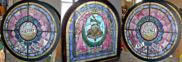 When the original Main Library at 629 Vine Street opened to the public in 1873, three beautiful and intricate stained glass windows graced one of the reading rooms in the building. In 1955, when the building was demolished, the windows were sold at auction, later to resurface as part of the decor of the Old Spaghetti Factory on Pete Rose Way. After the restaurant closed to make room for Paul Brown Stadium, the Library purchased the windows and began making plans to return them to the Main Library for the appreciation and enjoyment of our customers and staff. Thanks to the generosity of the Friends and the Annabel Fey Trust Fund, the three windows have now been re-created and restored to their original glory and will be on permanent display in the Main Library.