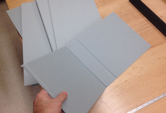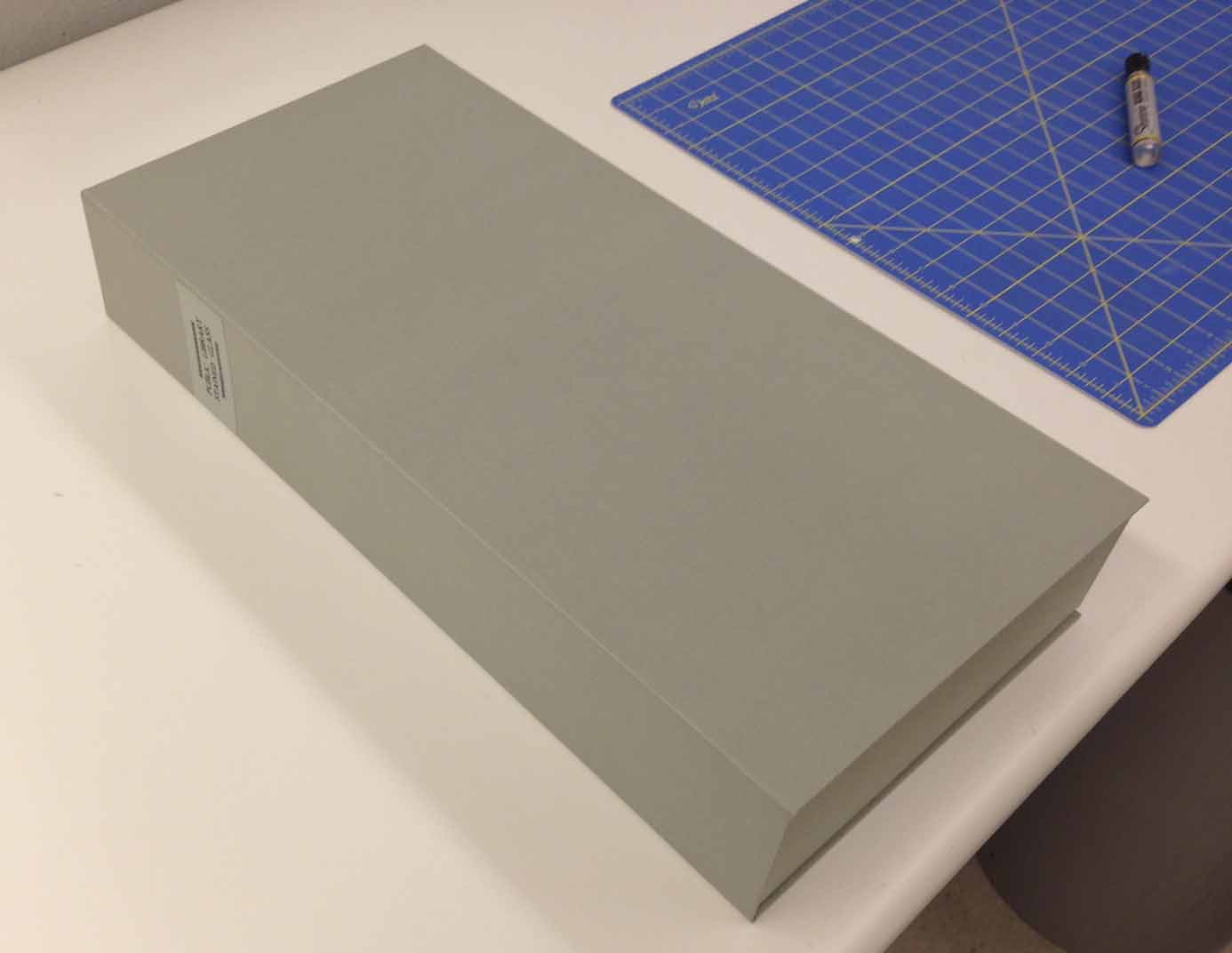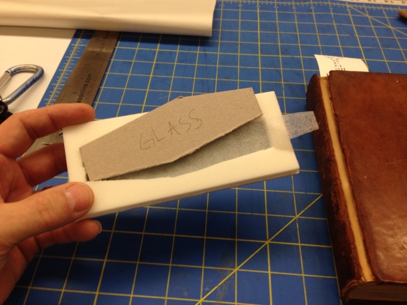 Each subject heading was housed in a customized sink mat. The boards for the sink mats were constructed out of corrugated board and were lined with Tyvek to provide a smooth surface and protect from moisture. Ethafoam sheets were used as a soft support for lifting the glass out from the sink mat. I was able to use some scraps of corrugated blue board under the ethafoam that would otherwise have sat in the bin forever. They were covered up anyway, and still served the purpose of providing strength with the added benefit of being lightweight.