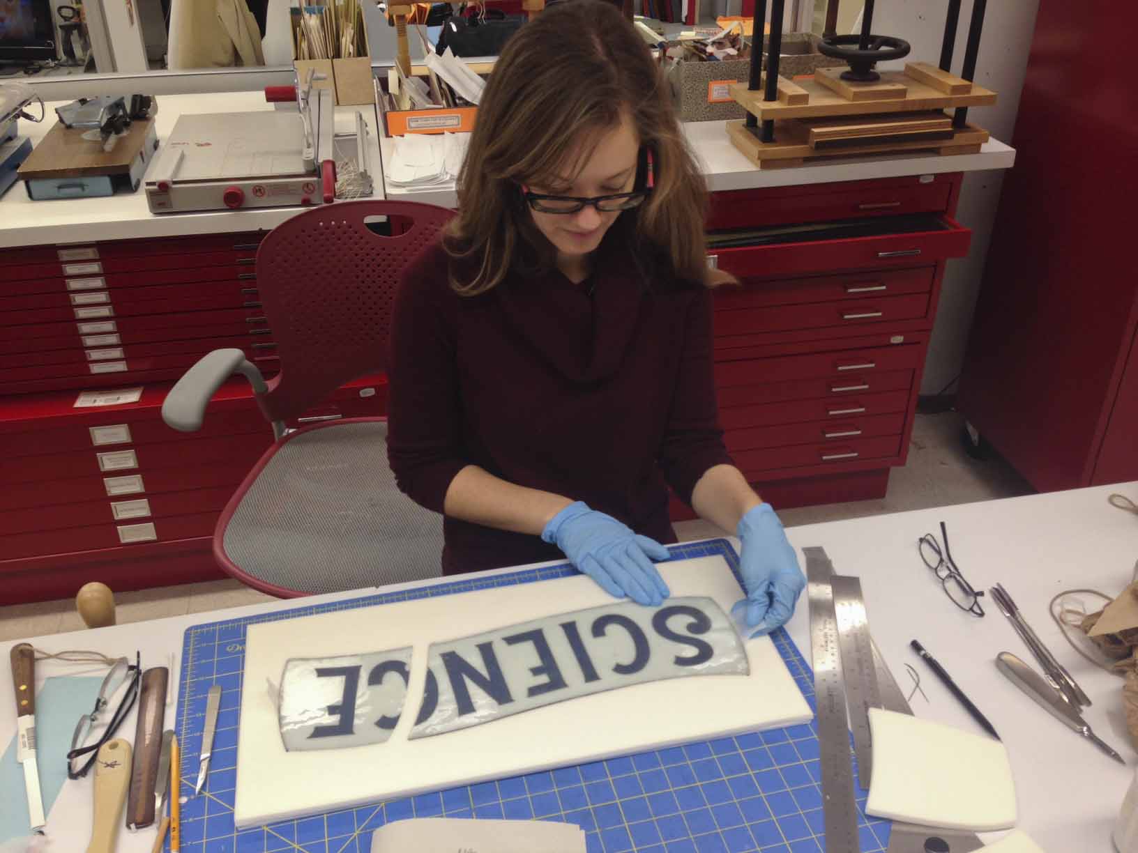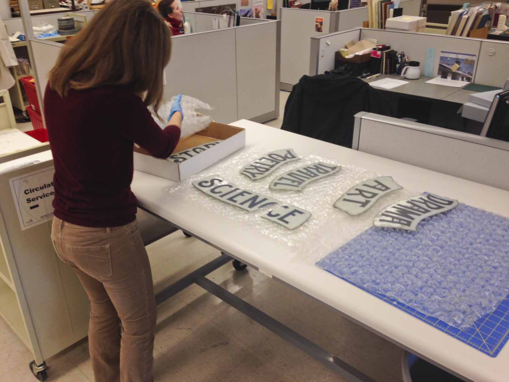 The original six subject headings; History,Poetry,Drama, Science, Art and Travel were kept separately from the permanent displays. Recently, they were given to our lab for housing. Because the stained glass was most likely furnished with lead elements, handling was potentially hazardous. We took precautions by handling them with rubber gloves. Thank you Mrs. Schieszer for your helpful kick-start to the project.