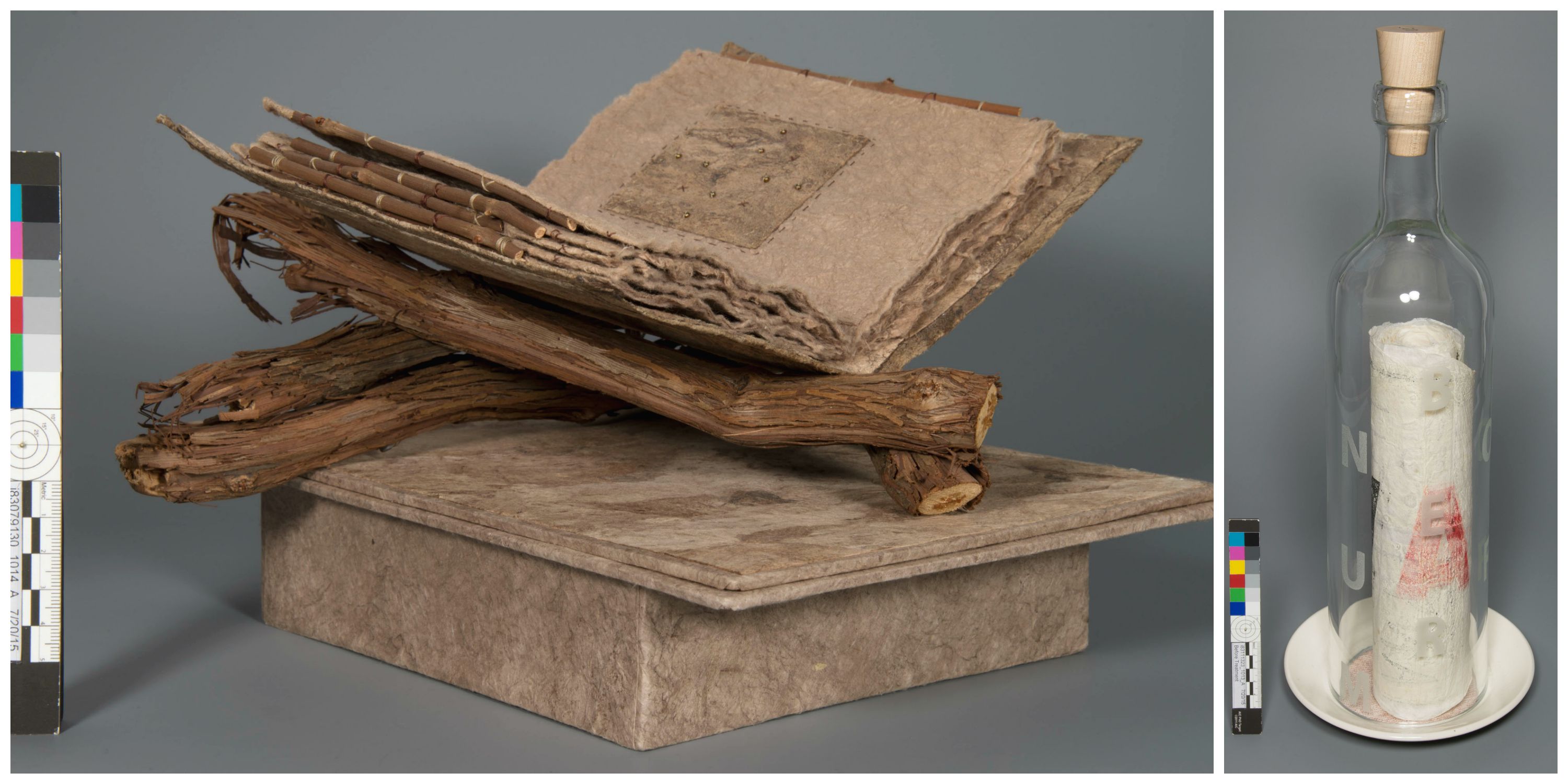 Each of these beautiful artists’ books has multiple delicate components (from a grape vine cradle to bottomless, etched, hand-blown glass bottle) that are going to require extra attention and a little creativity when it comes to housing them. Chris Voynovich, our box-maker extraordinaire, was assigned to create a clamshell box for Spirit Book #11, while I was assigned to construct one for Any Number of Things…since Ashleigh said “my eyes lit up when I saw it!” Chris and I cannot wait to start working on the enclosures for these amazing books; they are going to be very fun to work on.