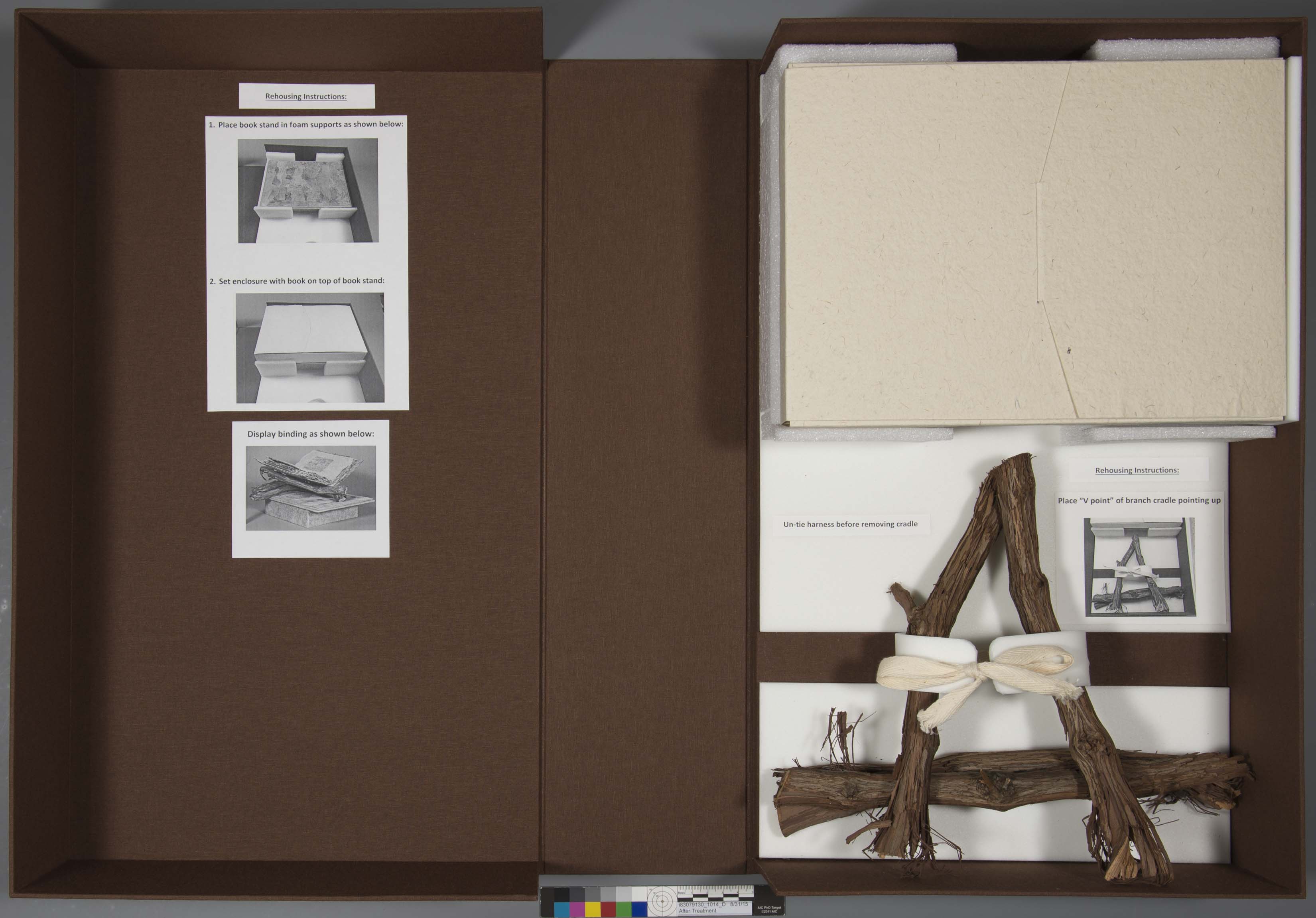 interior of clamshellChris, known for his masterful box-making skills and ingenuity around the Lab, created a beautiful cloth-covered clamshell box, in what seemed like a flash! He placed the book in a polyester film tuxedo box to protect it during handling by patrons yet keep it visible, then he placed that in a larger tuxedo box constructed out of handmade paper (to mimic the artist books’ amate paper) with foam filler. This tuxedo box was the same height and width as the artist book base, so that it could easily be stored on top of the base in the clamshell box. Next up, the grape-vine cradle! Chris wanted something gentle yet to secure to keep the fragile cradle in place. He opted to create a harness out of Volara foam and linen tape.
