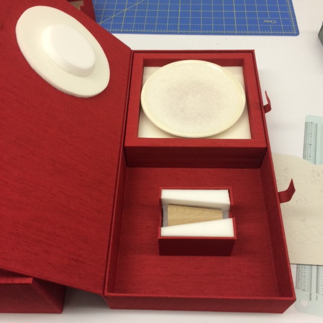 artist book piecesCeramic plate/stopper box: For this box I created a tray lined with layers of Volara foam on the bottom to house the ceramic plate. I further secured the plate with foam supports on the lid of the box. I made a mini tray with Ethafoam and plastazote foam supports for the wooden stopper. For this box, I used rare earth magnet closures…which was new and exciting for me, since I’ve never used them in an enclosure before.