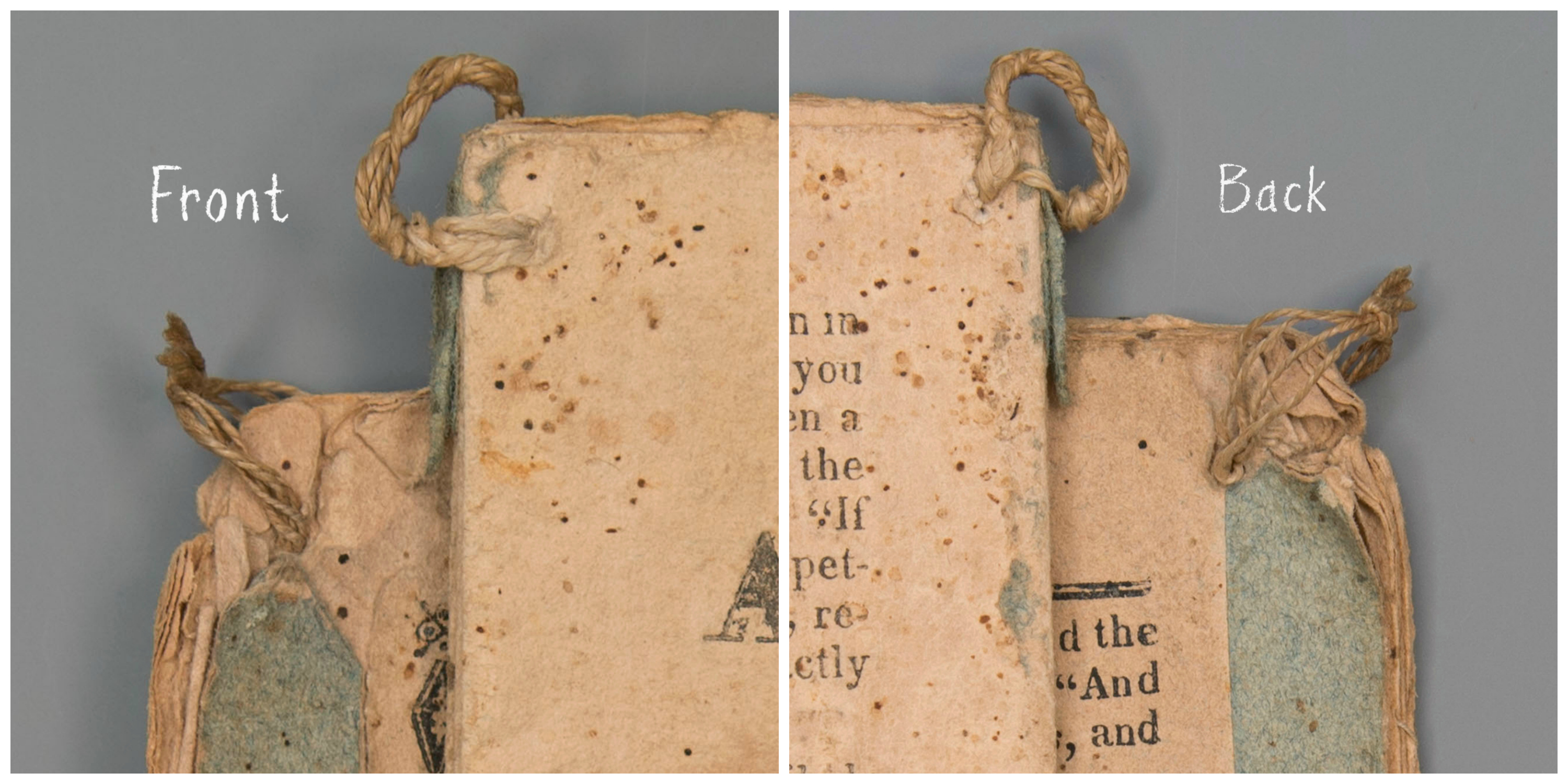 Some small booklets from the 1820s recently came to the Lab to be cleaned and prepared for digitization at the Public Library of Cincinnati and Hamilton County. Ashleigh, our Conservator, noticed a couple of them had a small loop of string attached in the upper left hand corner.