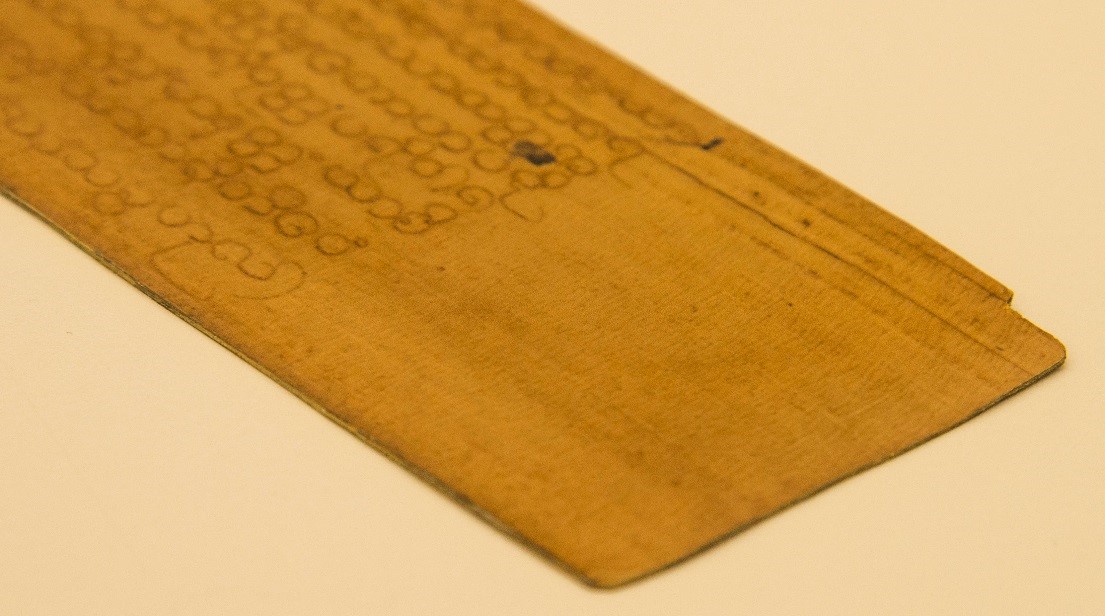 In August of this year, the Lab received a Palm leaf book from Archives and Rare Books library during one of our usual monthly meetings. This item was brought to the Lab to receive a new enclosure for a better long-term preservation storage and easier access. Along with a new enclosure, the Lab was asked to create two surrogates of one of the original Palm Leaves for classroom use. Under the direction of Ashleigh Schieszer, lab conservator, technician Chris Voynovich constructed the housing working closely with Catarina Figuierinhas who created the surrogate leaves.