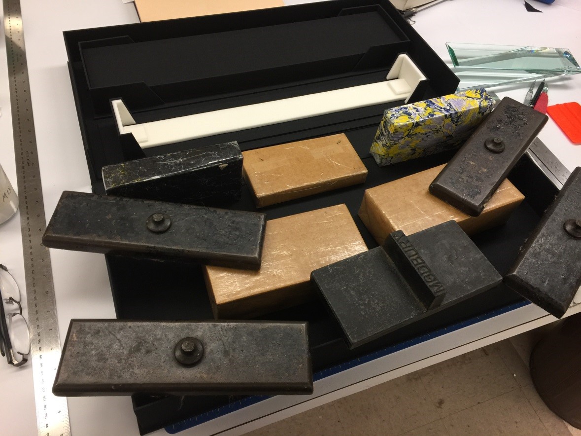 Using a structure engineered by our lab conservator, first, I created a double-sided sink mat with two open windows to display both sides of the two surrogates. Rare earth magnets were introduced as fasteners to hold the objects secure inside each mat. The surrogates are supported and viewable through a Vivak and polyester transparent L-sleeve, which is removable. The Vivak and polyester sleeve was welded together on the lab’s Minter ultrasonic welder.