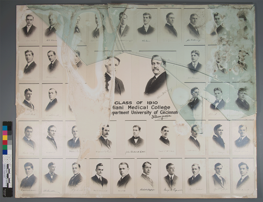 This photograph is part of the Henry R. Winkler Center for the History of the Health Professions collection and arrived in the lab with the original glass broken and partially attached to the photo. It is obvious under normal illumination that the photograph endured some kind of spill or water damage, but under UV florescence you can better make out the path that the water or perhaps beverage created and even note splotches of possible mold damage (which flourese purple). Now that’s it’s photographed I’ll turn it over to Ashleigh, our conservator, to determine what’s happened to this poor thing and the best course of action when it comes to treatment and storage.