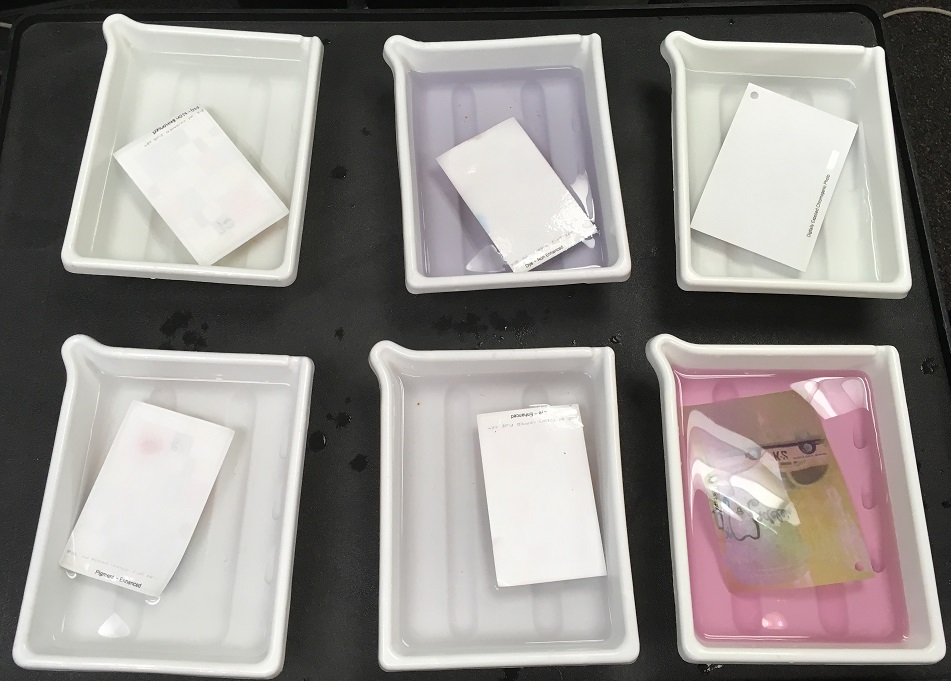 Dye-sublimation prints are the least common of the three main types. The analog version of the process was invented for the textile industry and the digital version continues to be used to print images on fabrics as well as photo gifts like mugs. It doesn’t require liquid chemicals so it’s also popular for ID photos, photo booths, and instant photo kiosks in drugstores. Generally speaking they can be stored and handled using the same guidelines as chromogenic prints as their vulnerabilities are similar. Light can cause fading over time, very high heat can cause bleeding. Most importantly though, while the clothes and mugs are obviously washable, the photos can delaminate in water, as shown below.