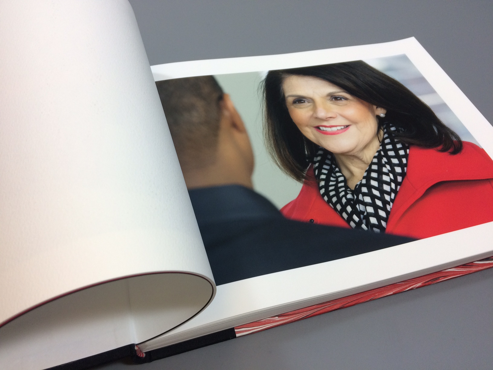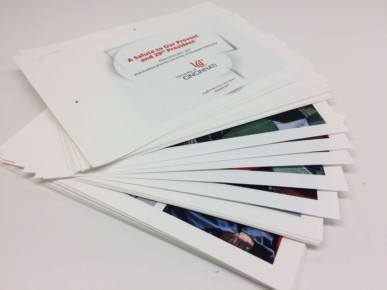 As a farewell gift and appreciation for all the work and time dedicated to the University of Cincinnati, The Preservation Lab was asked to create a custom binding for an Album for the Provost and 29th President Beverly J. Davenport. UC Government Relations and University Communications provided the lab with single sheets printed with photographs of Dr. Beverly J. Davenport during her time at the University of Cincinnati.