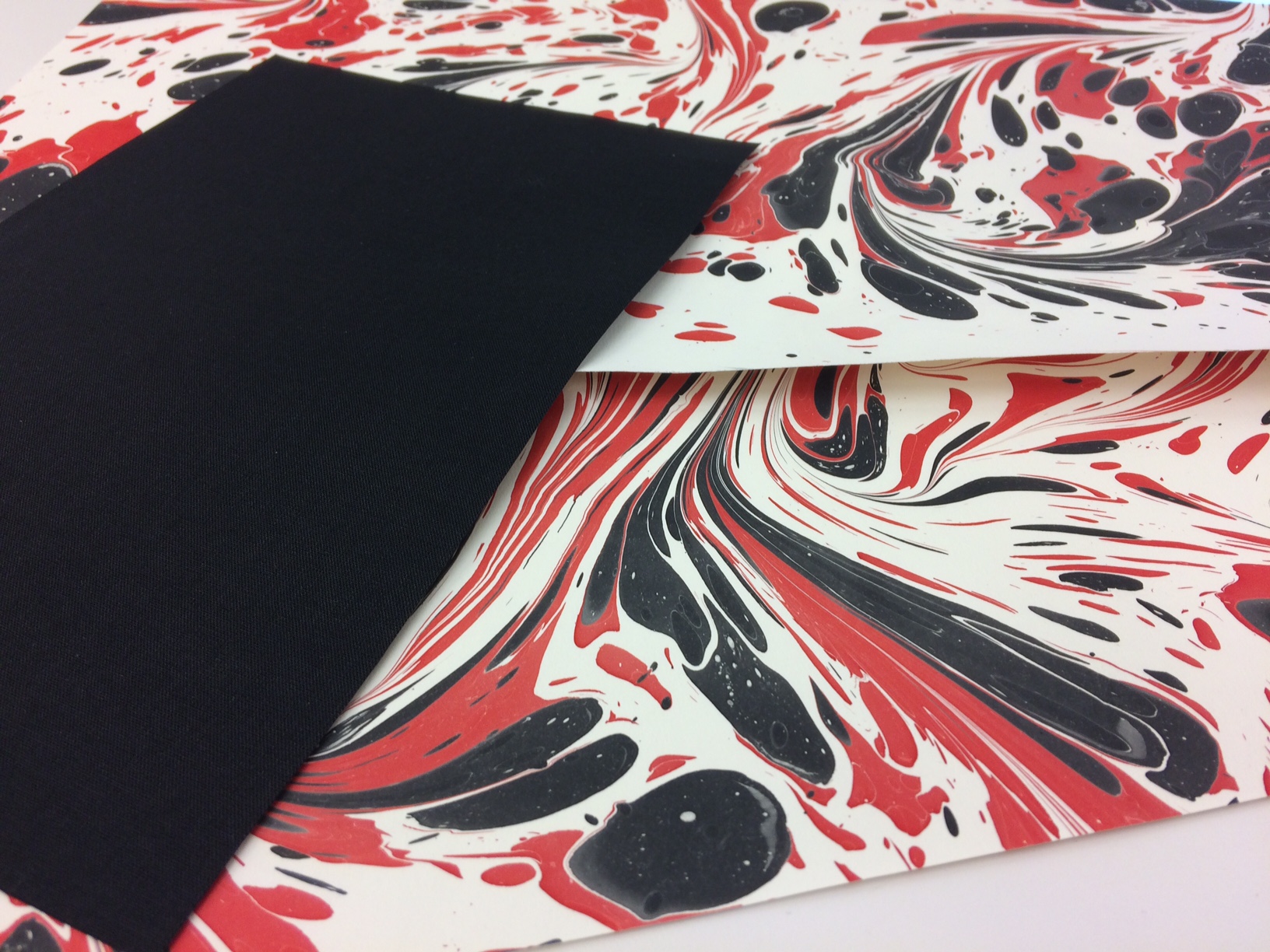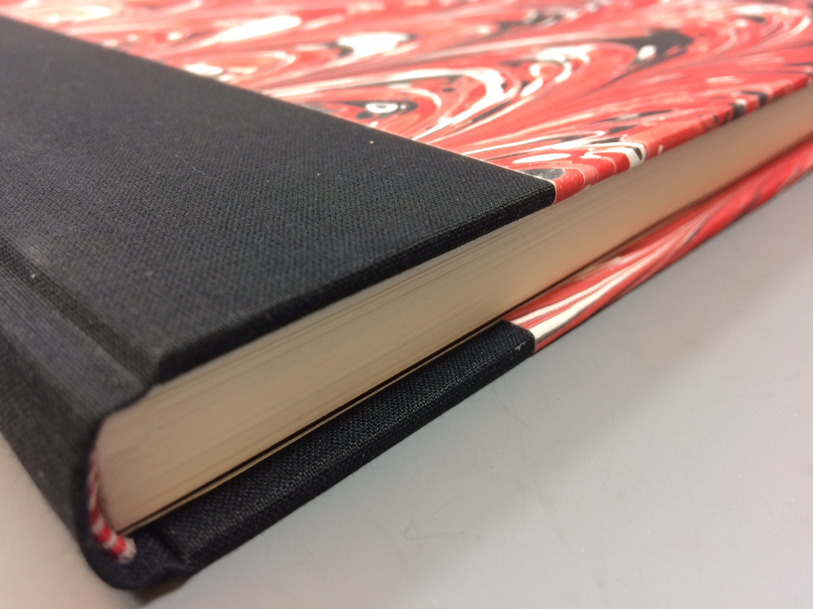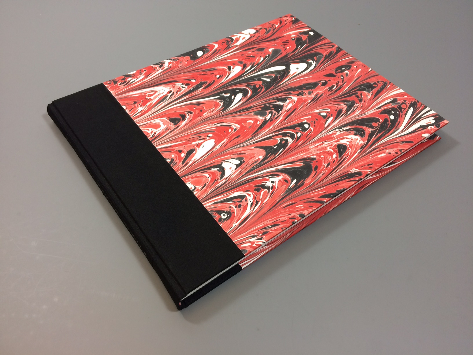 Once the textblock was finished, the cover was created, a cloth cover quarter binding. To continue with the theme of UC colors, a marbled paper with red and black tones was chosen. A black cloth was chosen for the spine lining. The album received striped red stuck- on endbands.