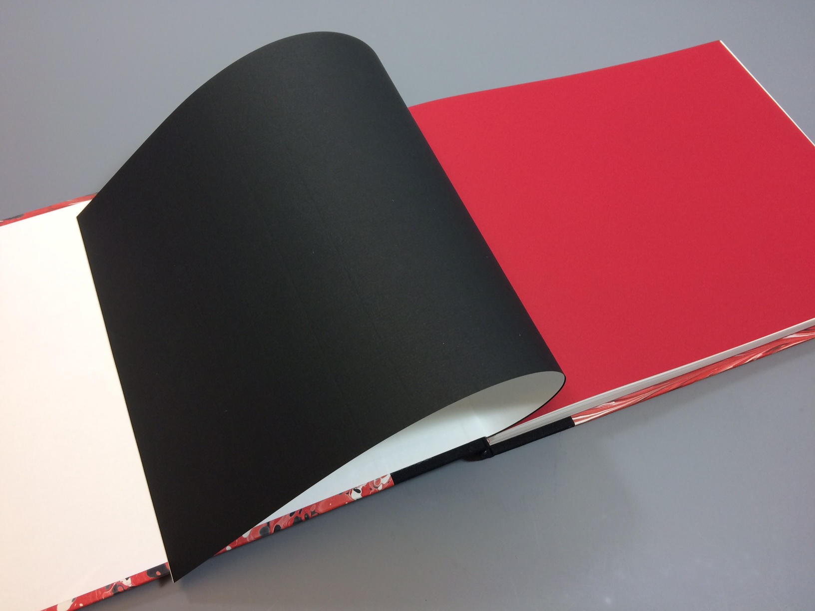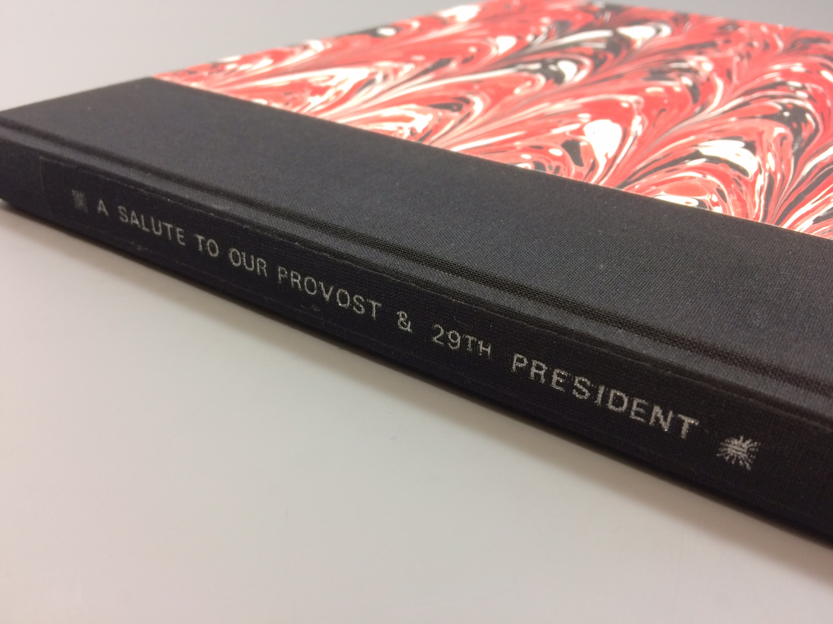 Once the textblock was ready, endsheets and pastedowns were selected. In this case since this book was dedicated to our Provost and 29th President, the color of the endsheets where the colors of UC, red and black. A white paper was chosen as a pastedown.