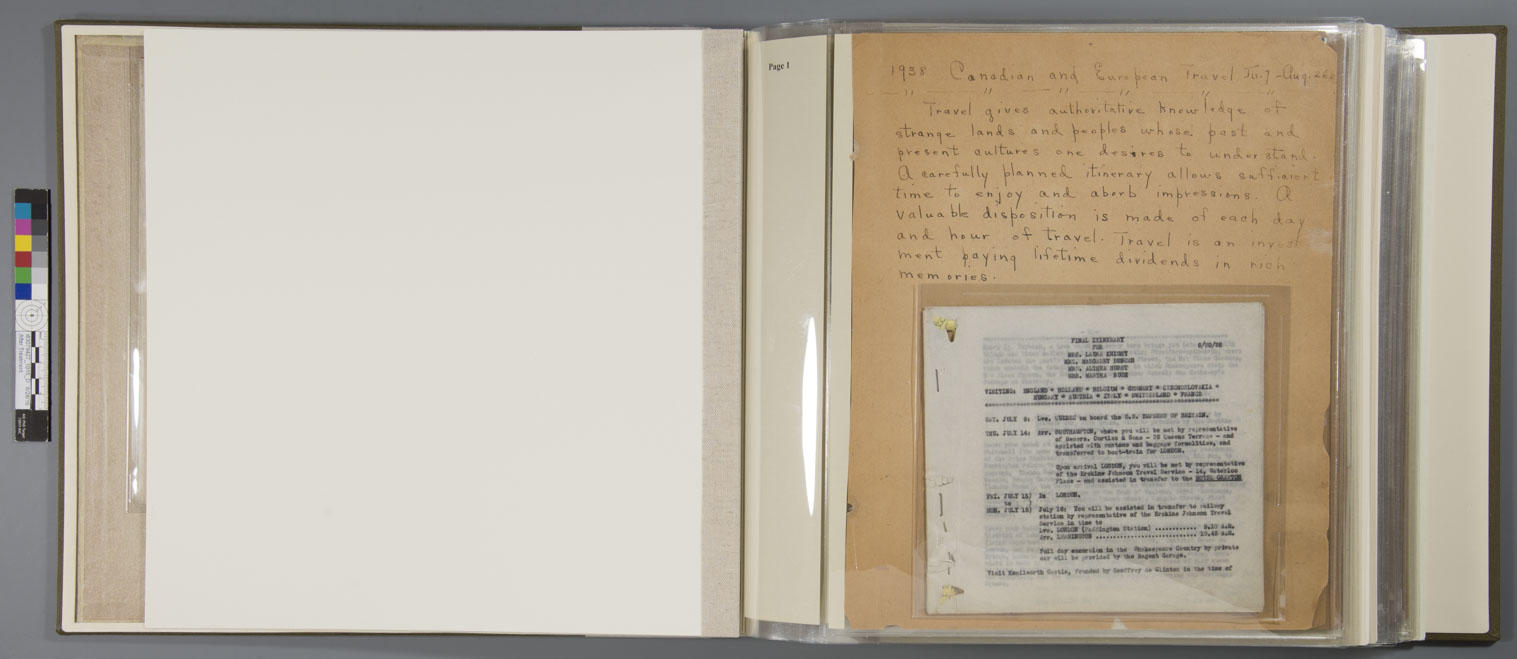 Althea Hurst scrapbook, view of inside upper cover and first page, before treatment.