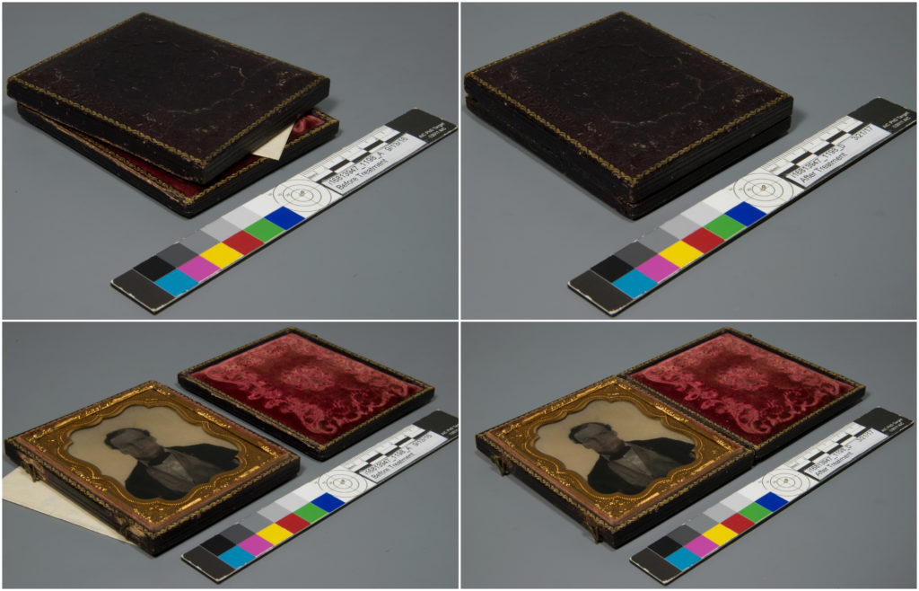 (Left) Before “bench” photos of one of the cased photographs labeled “John Wesley Lever”, (Right) After photos of the mended case.