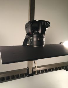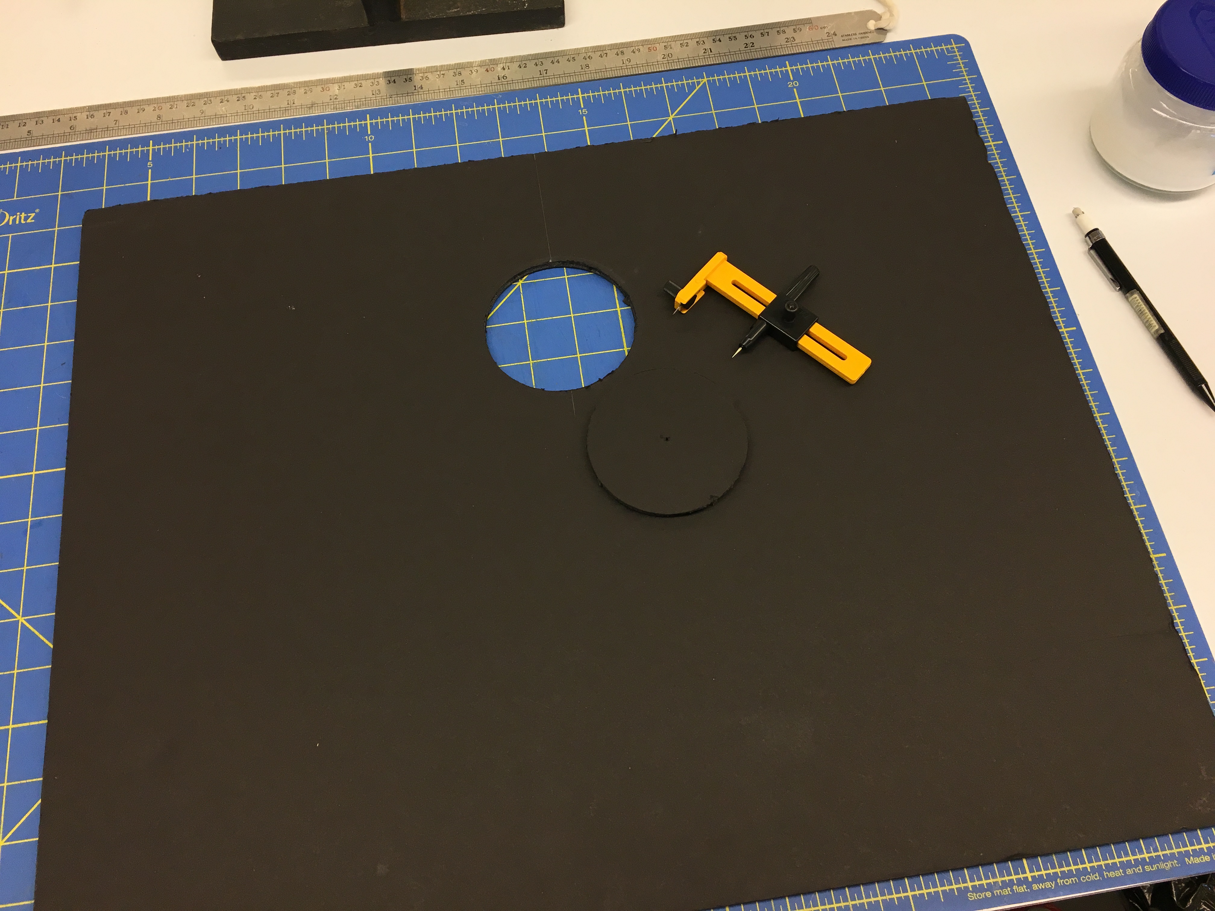 In order to mount this black foam core on the camera lens I measured the diameter of our lens and the distance from the edge of the lens to the neck of the copy stand when the camera was in place.