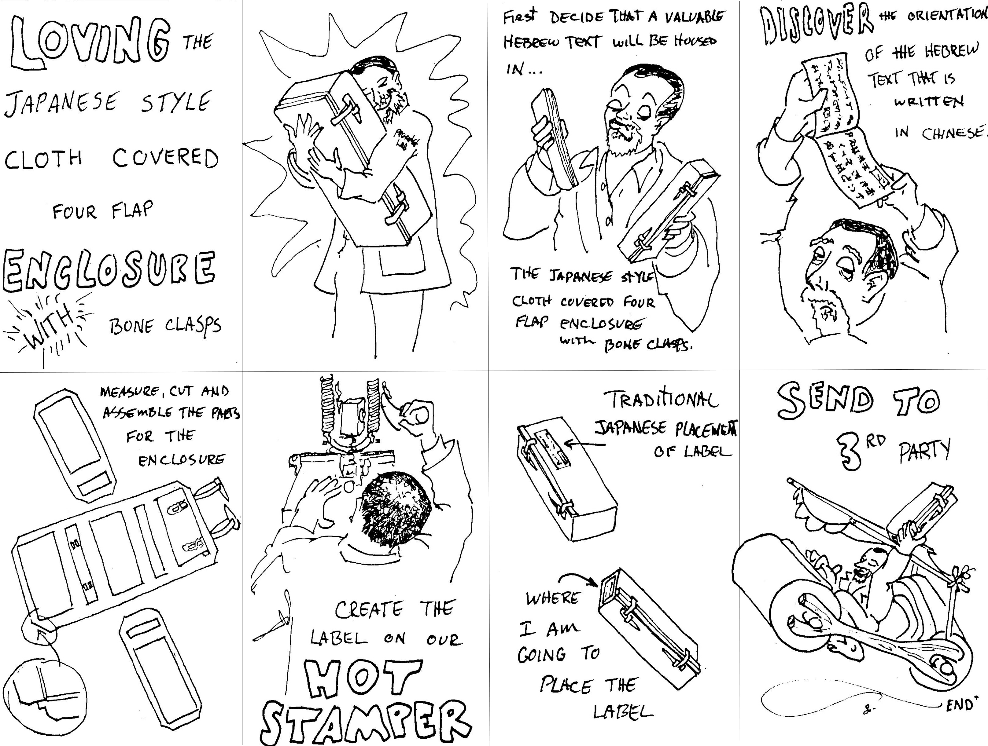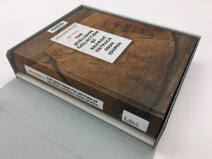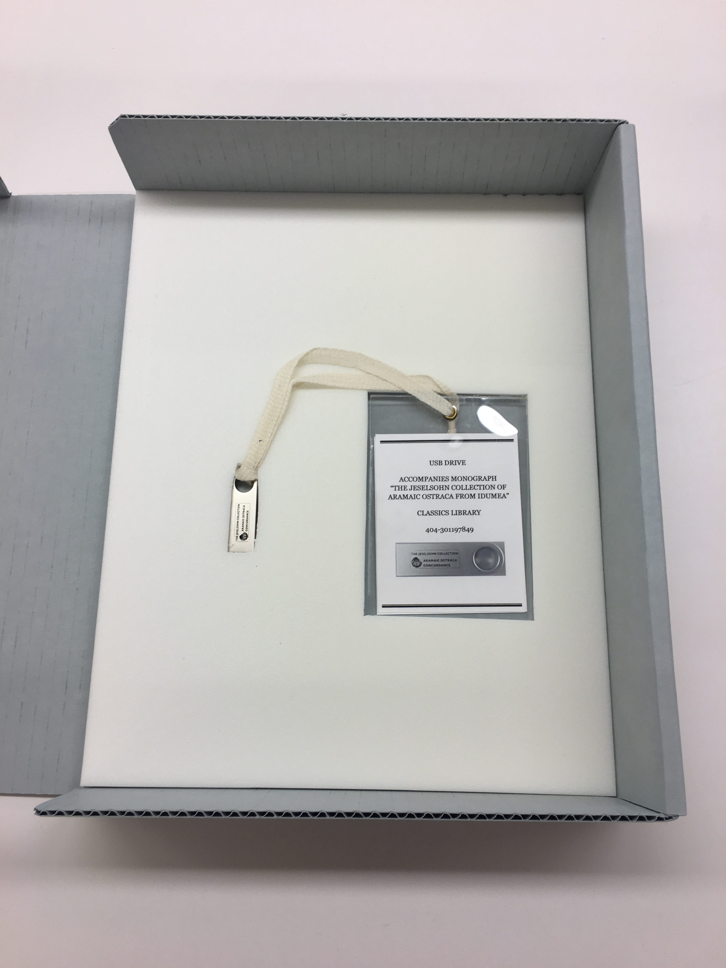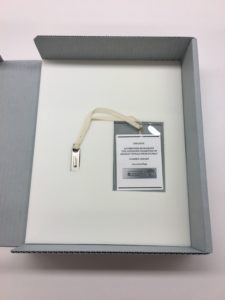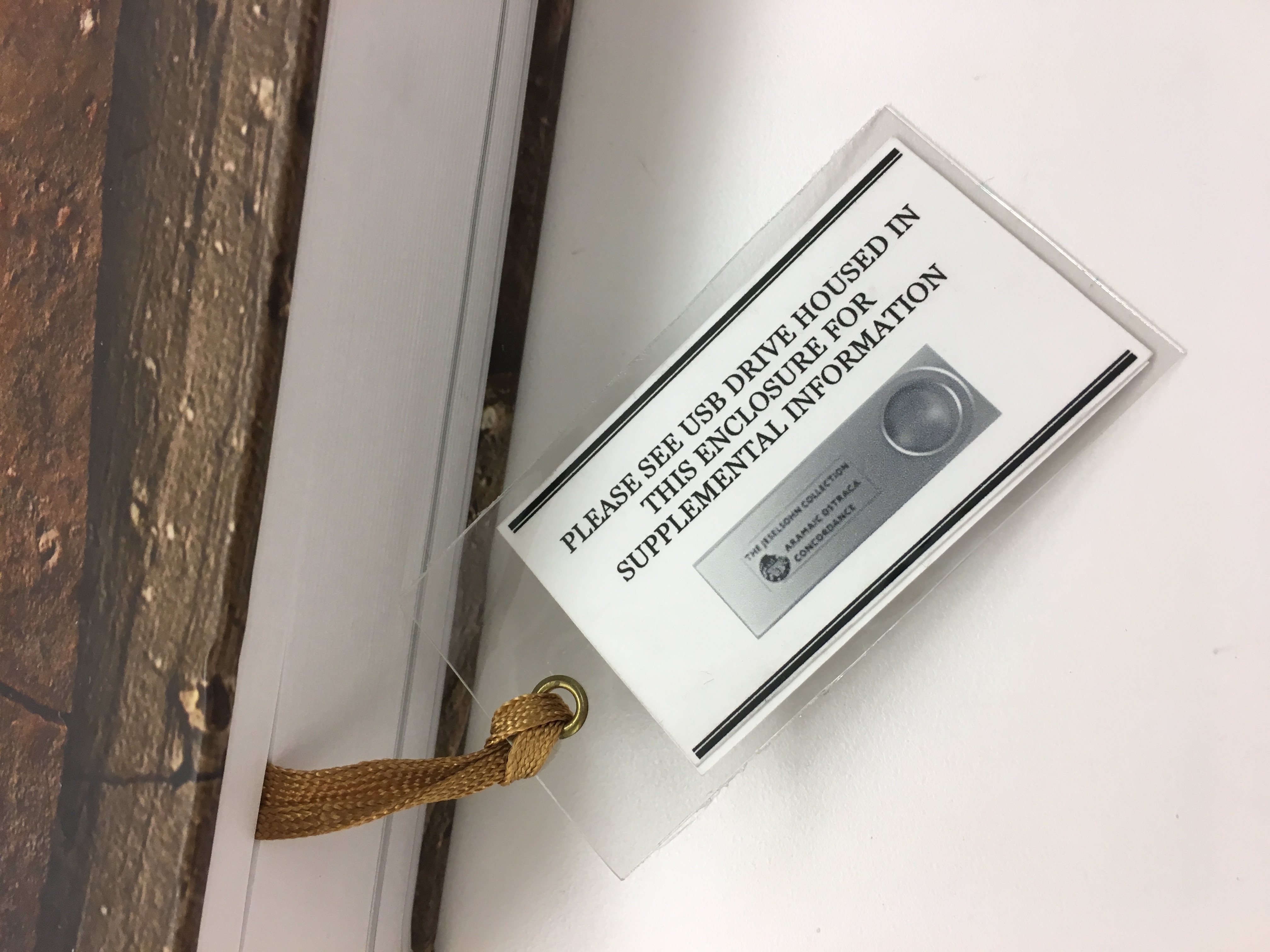 Our solution was to make a simple corrugated enclosure with a volara foam compartment and a photographic surrogate on the end of the bookmark. The surrogate directs users to the compartment holding the USB port. Additionally, a message in the item record alerts library workers to “check for one USB device”.