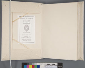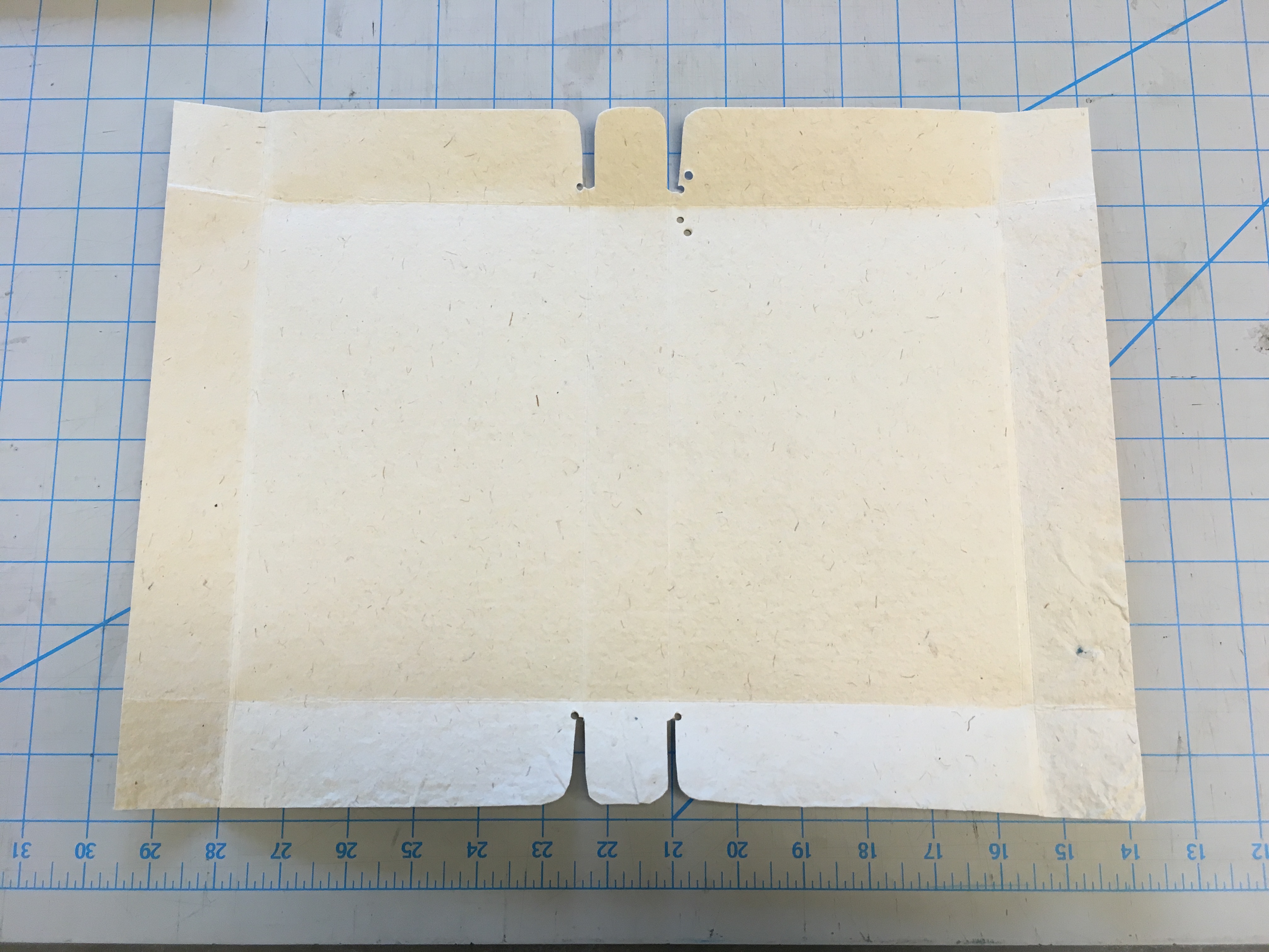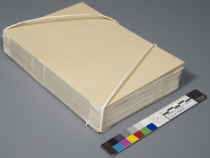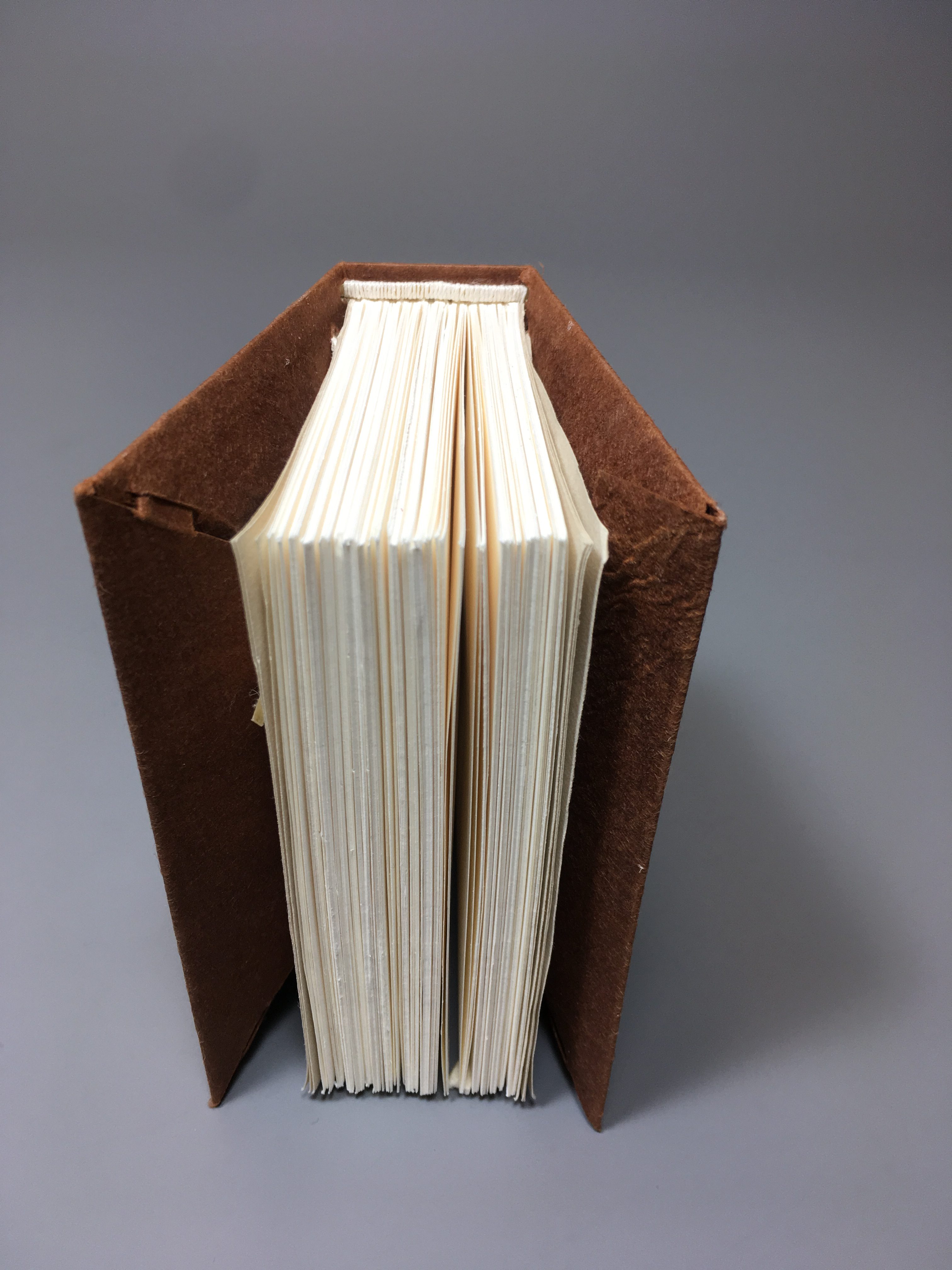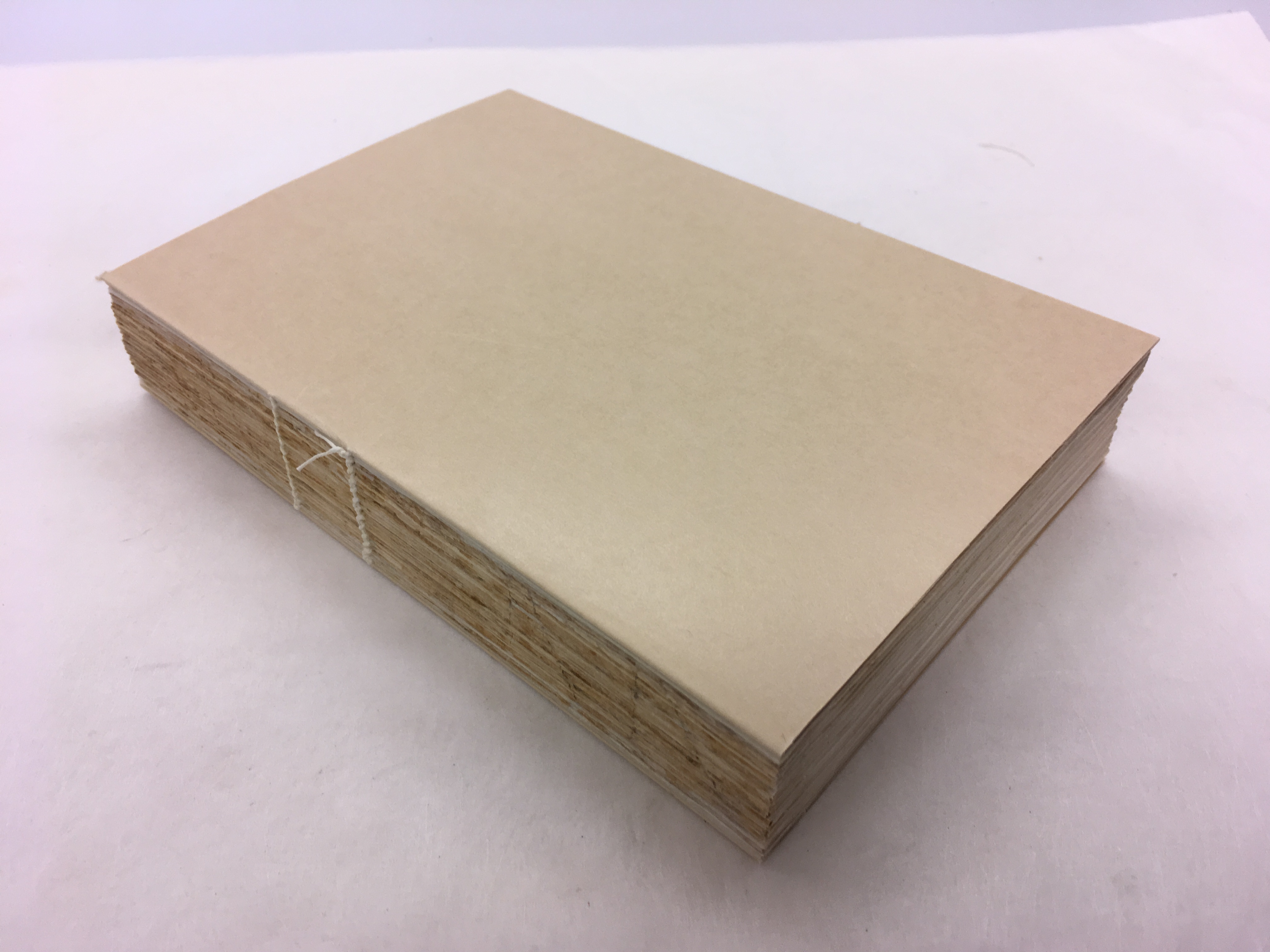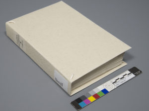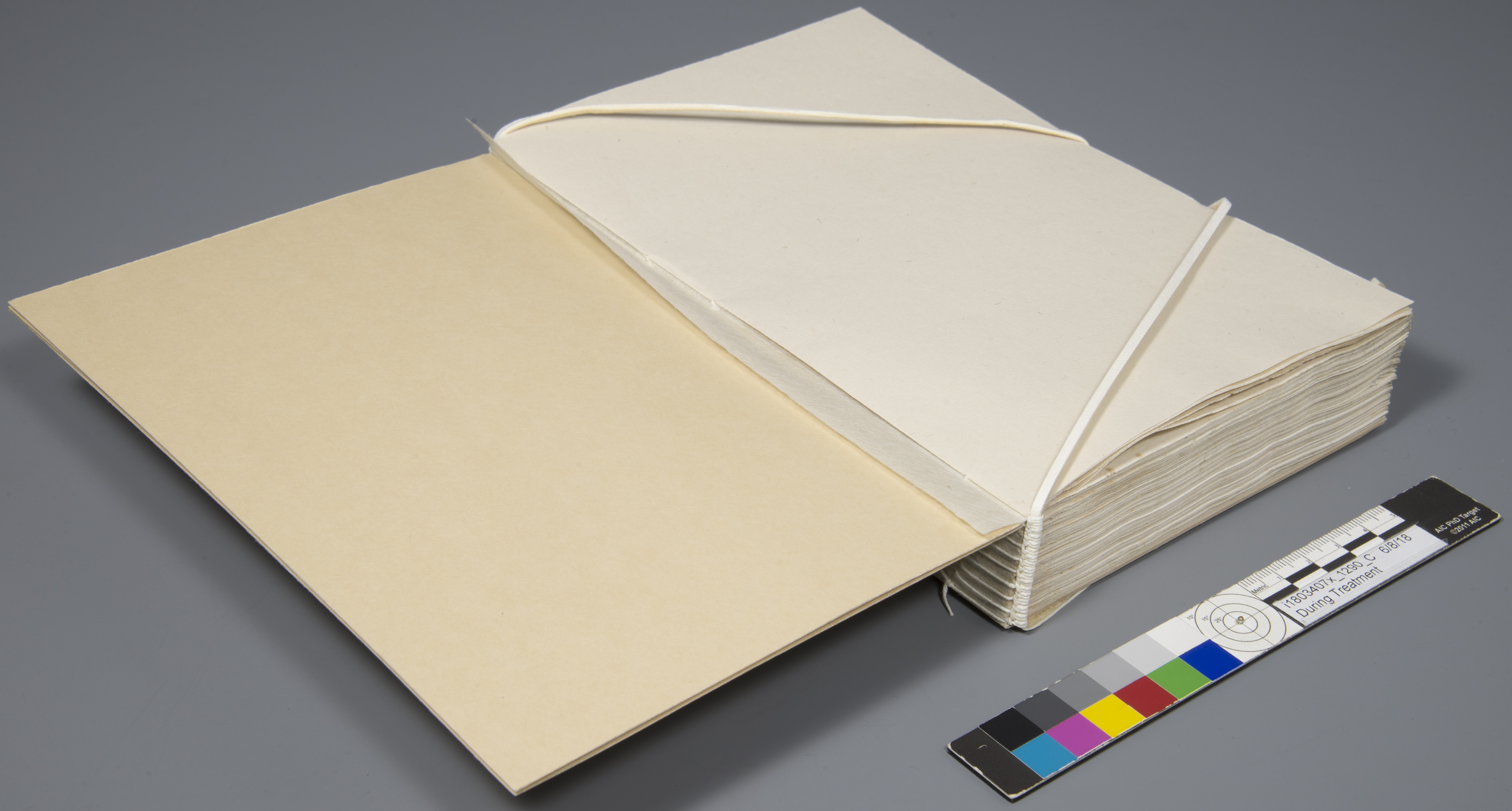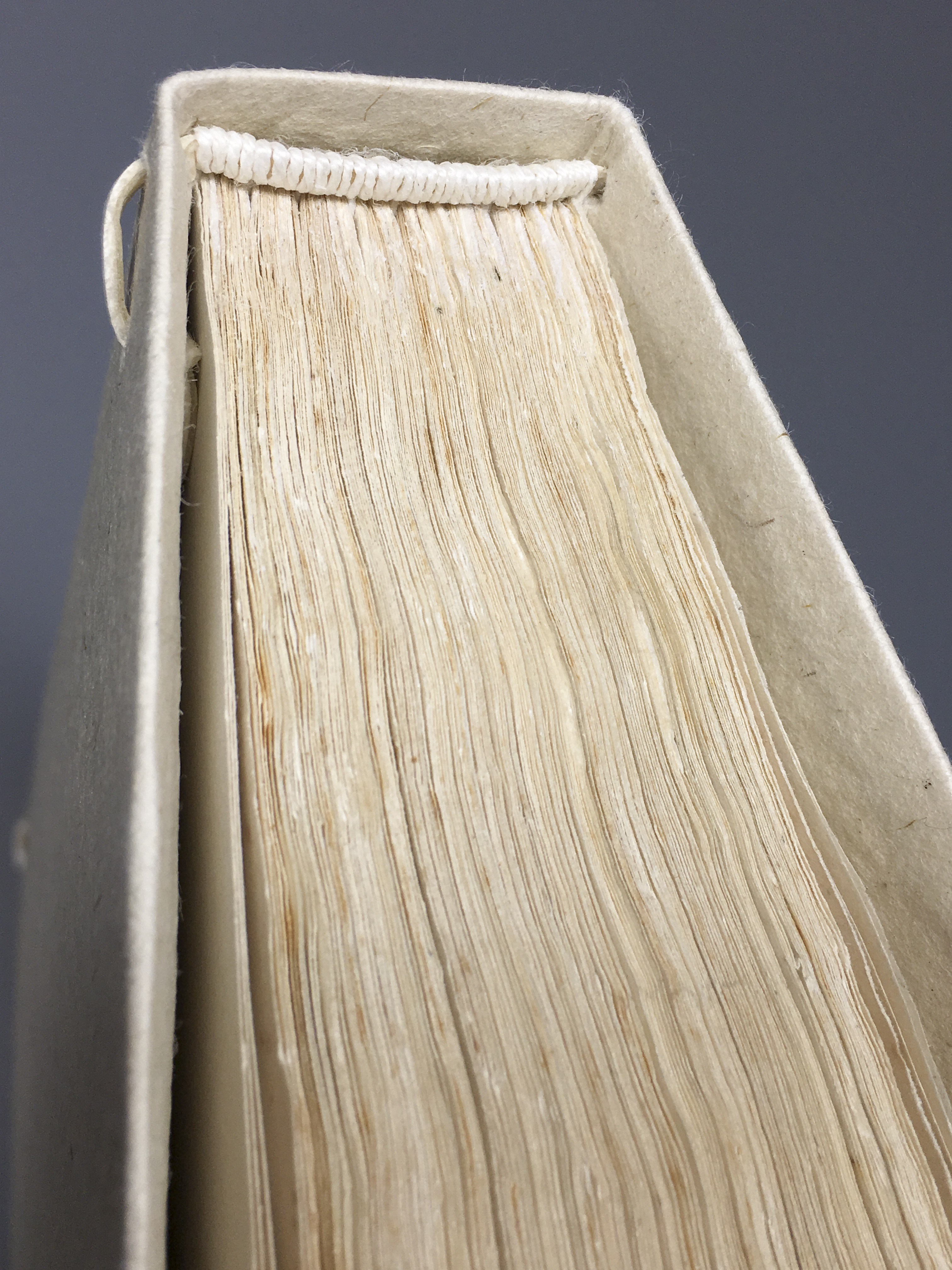 In preparation for the new cover, a combination of sewn boards binding by Gary Frost, limp vellum binding and non-adhesive paper case by Karen Hanmer, two folios of 10 point board Bristol were sewn onto the textblock, one on each side, and lined on the inside with a sheet of 20 point board adhered with PVA.