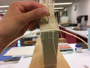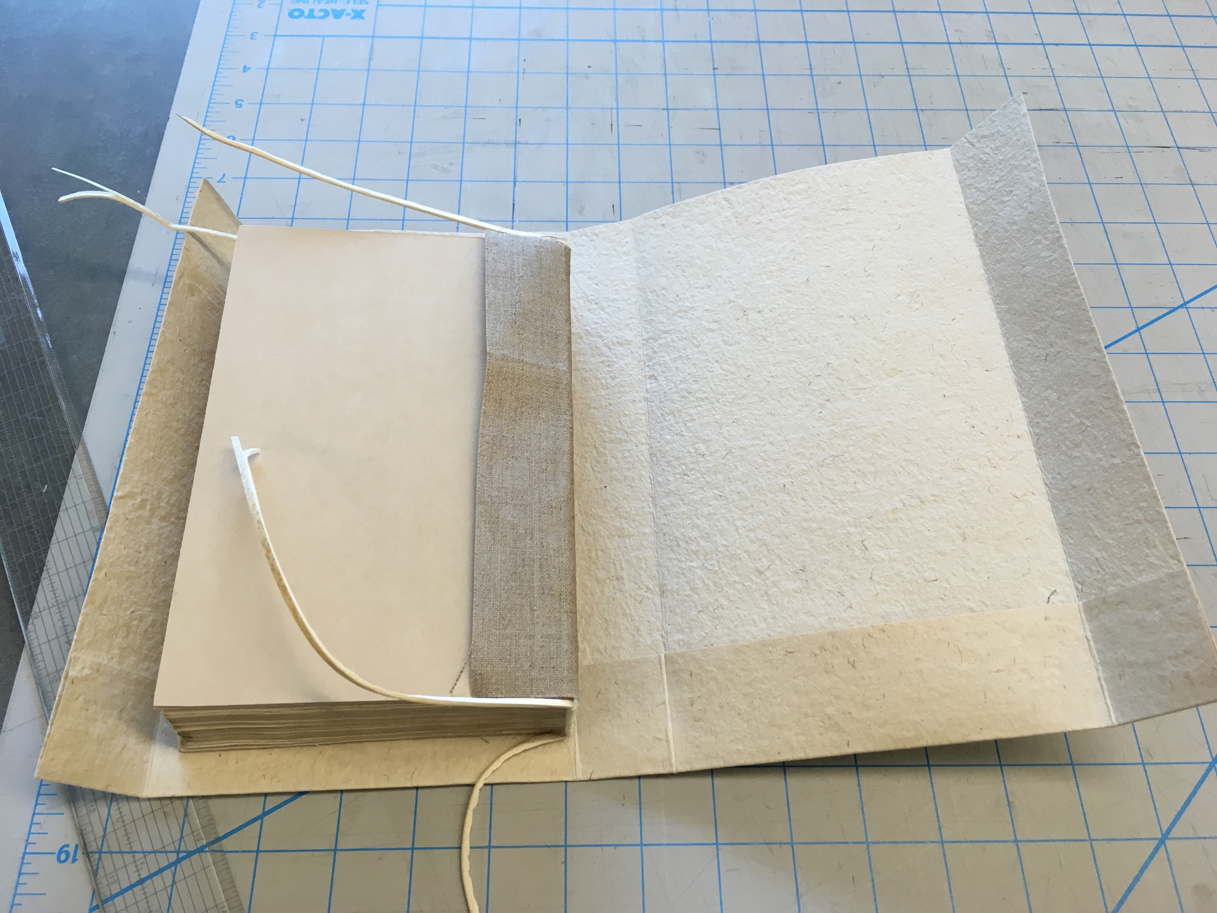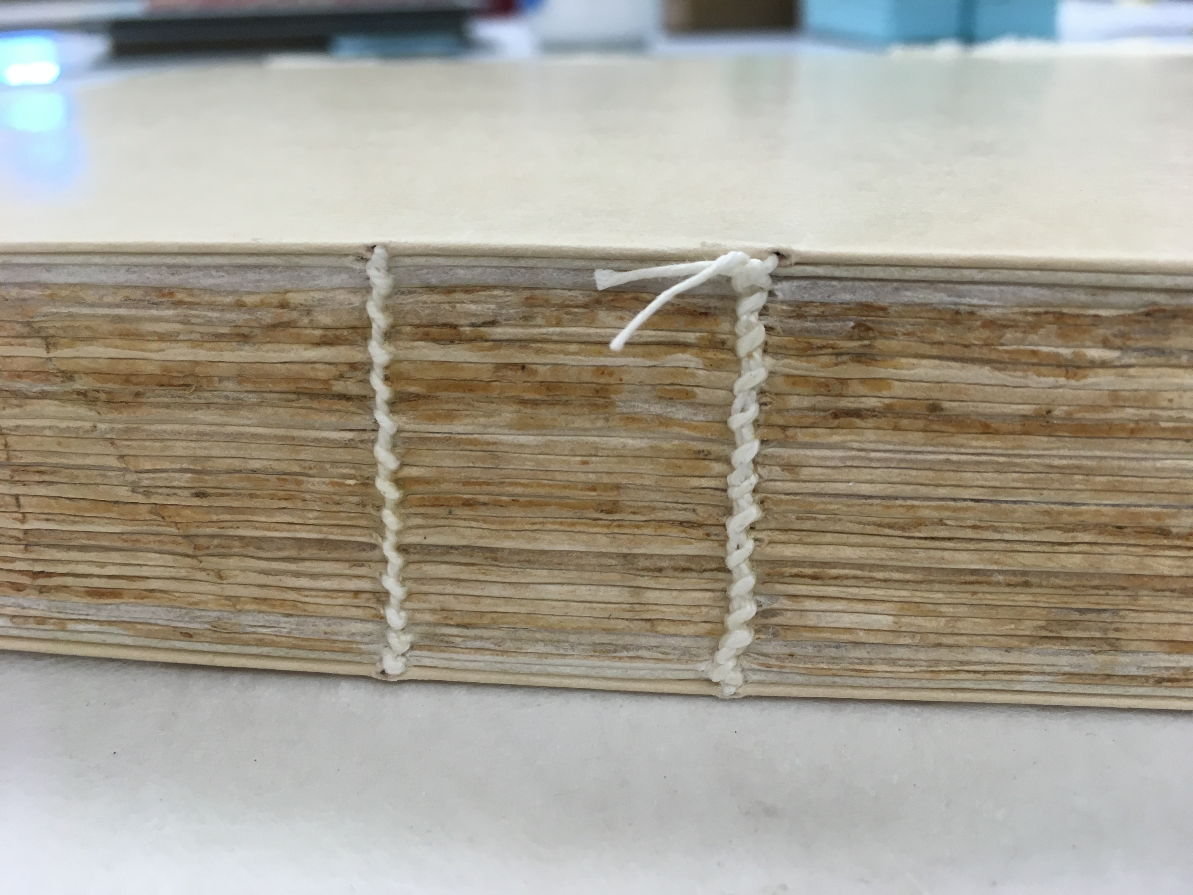 Inspired by the Smithsonian Archives AIC poster, Ashleigh suggested a combination of a sewn boards binding from Gary Frost and a limp vellum binding, adapting the structure of a non-adhesive paper case I learned with Karen Hanmer. Together we decided to explore a combination of all binding structures. Using the sewn boards binding for inspiration, we sewed on library boards as an extra set of endsheets, in addition to paper endsheets. Conservation endbands were sewn on with a back bead, similar to a vellum binding, and were laced through the endsheets and cover, providing extra support and flexibility to the two sewing stations.