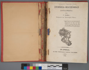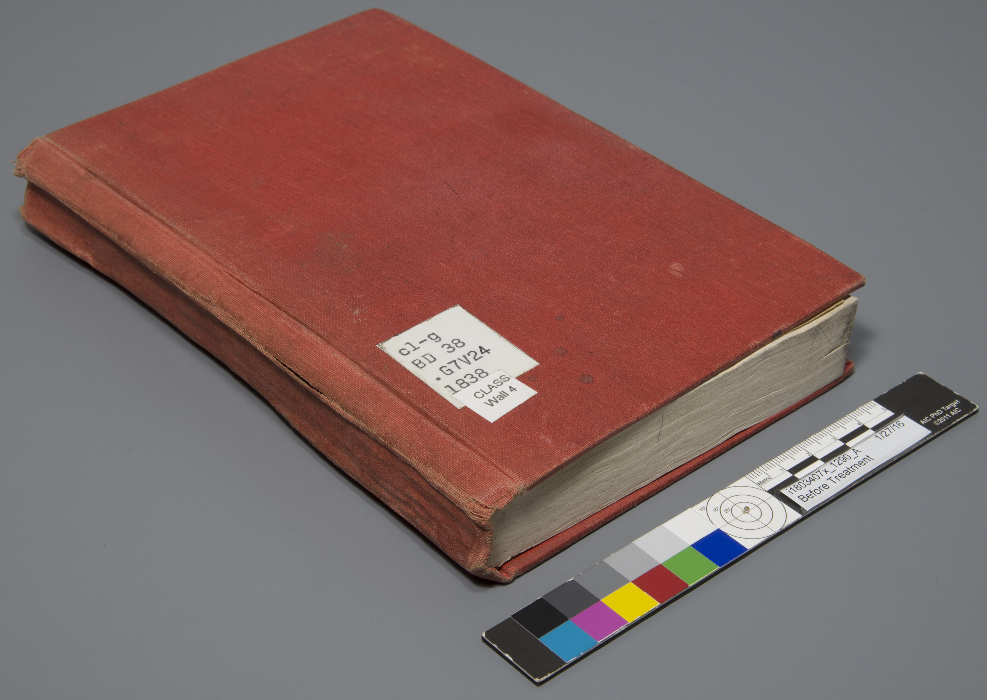 The lab received this book from the UC Classics Library in very poor condition. Ashleigh identified that the red cloth cover was not original to the textblock and overtime it had fallen off, exposing prior binding repairs. Paper fragments along the spine indicated to her that the binding was once originally cased in a paper wrapper before being rebound in a variety of ways. The book, originally sewn with only two sewing stations, had also been side stapled (!!).The staples were extremely corroded, staining the textblock and causing tears along the spine of the textblock pages, however; the original folded gatherings were mostly intact with original sewing stations revealed.