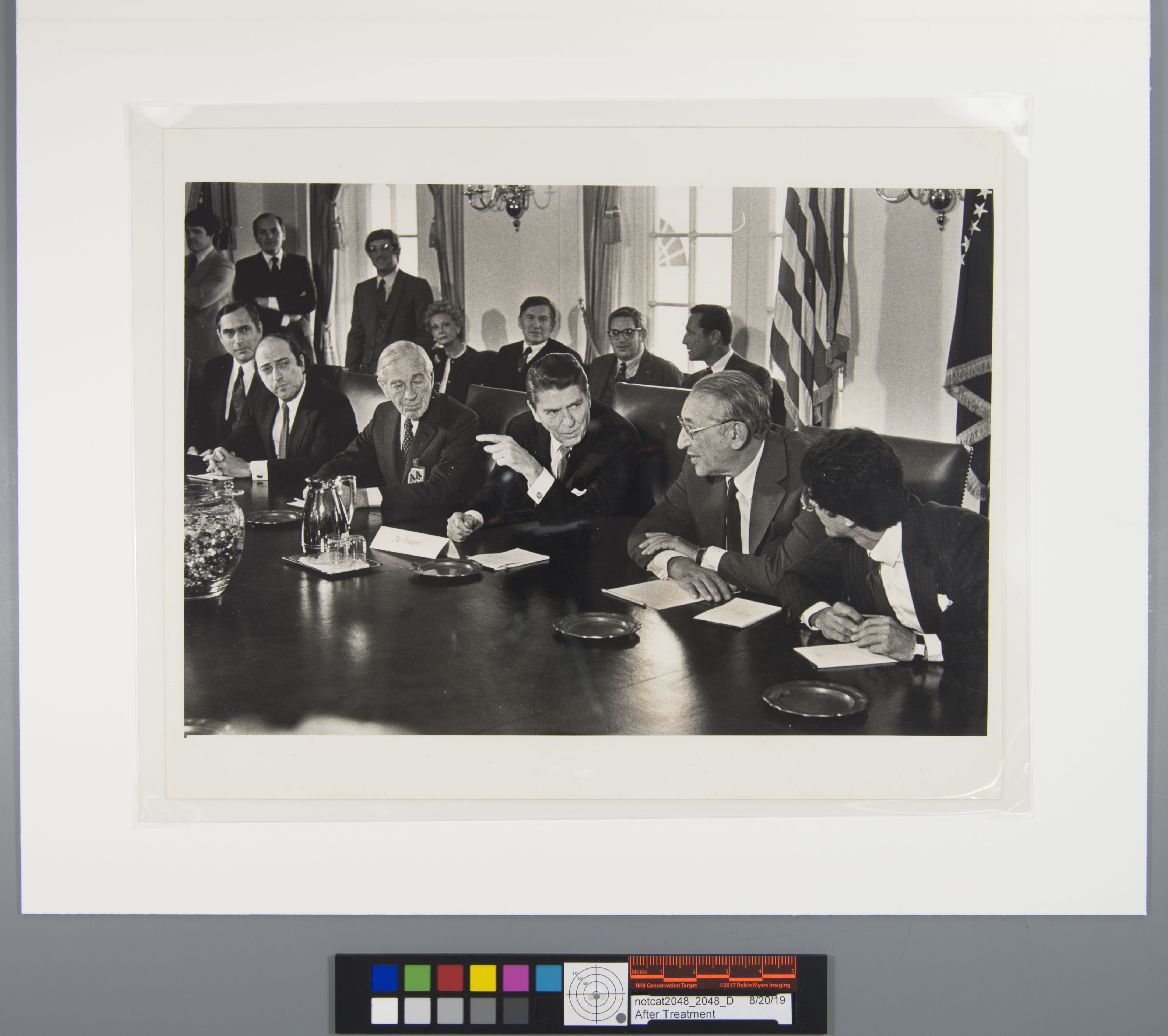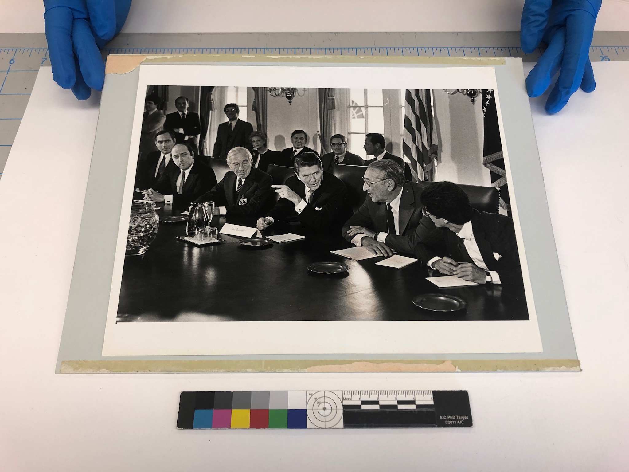 In July of this year, I had the pleasure of assisting on a photograph treatment of Ronald Reagan, which came to us as part of a collection of items belonging to UC alumnus Benjamin Gettler. It came with a small handful of very old jelly beans from President Reagan’s desk that Mr. Gettler had taken as a souvenir during his visit. While the image itself was in very good condition, it was mounted to an old backing board, which required removal and cleaning so that the image could be digitized and rehoused.