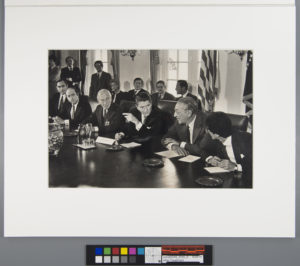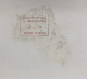 When the work was complete, we revealed what appeared to be a handwritten graphite inscription, and an identifying stamp belonging to the late Bernie Boston (1933-2008), a photojournalist who was the director of photography for the now-defunct Washington Star at the time the photograph was taken. Mr. Boston was a finalist for the Pulitzer Prize in 1987, and his best-known photograph is known as “Flower Power,” a Pulitzer-nominated 1967 photograph depicting a Vietnam War protester placing a carnation into the barrel of a soldier’s rifle during a protest march in Washington, D.C. Discovering the stamp was a truly unexpected discovery that provided a new layer of importance!