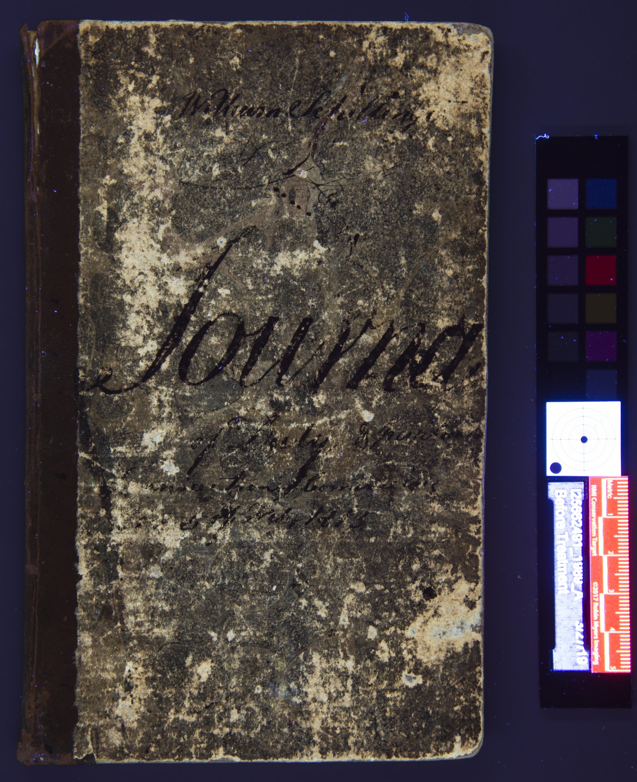 SUBJECT: This is a quarter binding laced case with a leather spine and decorative marbled paper on the upper and lower covers. There is faint (iron gall) ink inscriptions on the upper and lower cover that are fading and obstructed by the marbled decoration.