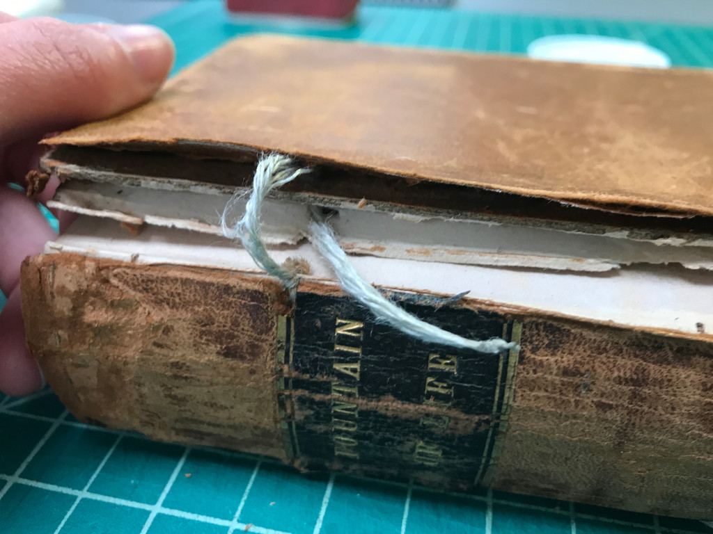 While the leather on the outside of a book is what most of us see when we look at our books and bookshelves, a large portion of the workshop focused on how those books are put together. If you’ve seen a leather book, you have likely seen a book that has its covers detached or missing. We talked about reattaching covers using techniques such as joint tackets, sewing extensions, slitting and slotting the boards, and tissue repairs. These are techniques that need to be considered before a leather reback, which was the final technique we learned, would take place.