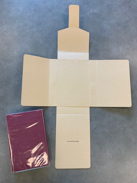Lastly, cut a slot for the tongue to fit into which secures the tux box closed. Close the tux box as if it is finished with tongue out. With a pencil draw a light “v” in the corner where the tab lays closed. Open the tab and place 2 small holes with a Japanese hole punch or an awl. Cut 2 lines connecting the holes forming a slot. Fit tab into the slot to close. Feel free to round the corners of the tab and all flaps using a corner rounder.