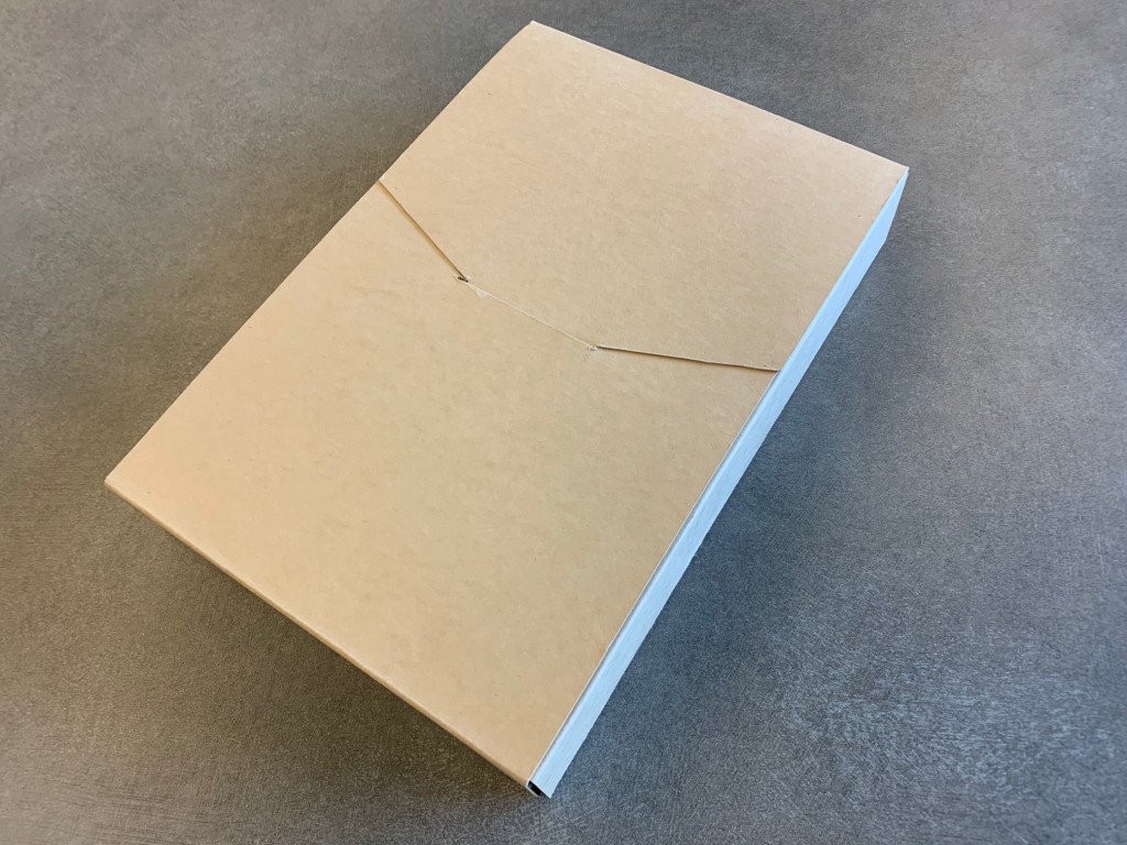 A tux box serves admirably the need for a cheap, easy first line of defense. We usually create tux boxes using 20-point Bristol board with measurements custom to the book. The tux box provides an adequate barrier against dust and light. Another virtue of the tux box is that old books that have suffered degradation and have become brittle are provided a more stable structure for storage and handling. It should be mentioned though that because of the nature of the design, temperature, humidity and some dust and light may enter inside the tux box through the exposed corners, possibly allowing these damaging elements inside.