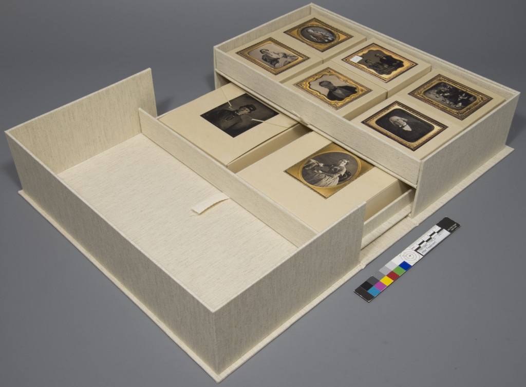 One of my favorite aspects of the job here, in the lab, is designing and creating custom enclosures. This collection of rare daguerreotypes, ambrotypes, and tintypes is an example of adapting a standard cloth covered clamshell to accommodate a collection. I created two trays with pull tabs that are removable for easy access and display. Each photograph has its own tuxedo box and is set in polyethylene foam (Volara) for protection. The tuxedo box enclosures are identical in size to reduce confusion while repacking. Check out this blog created by Jessica that shows a gif of the enclosure opening and closing, and this blog post showing a similar enclosure I created for a dairy collection.
