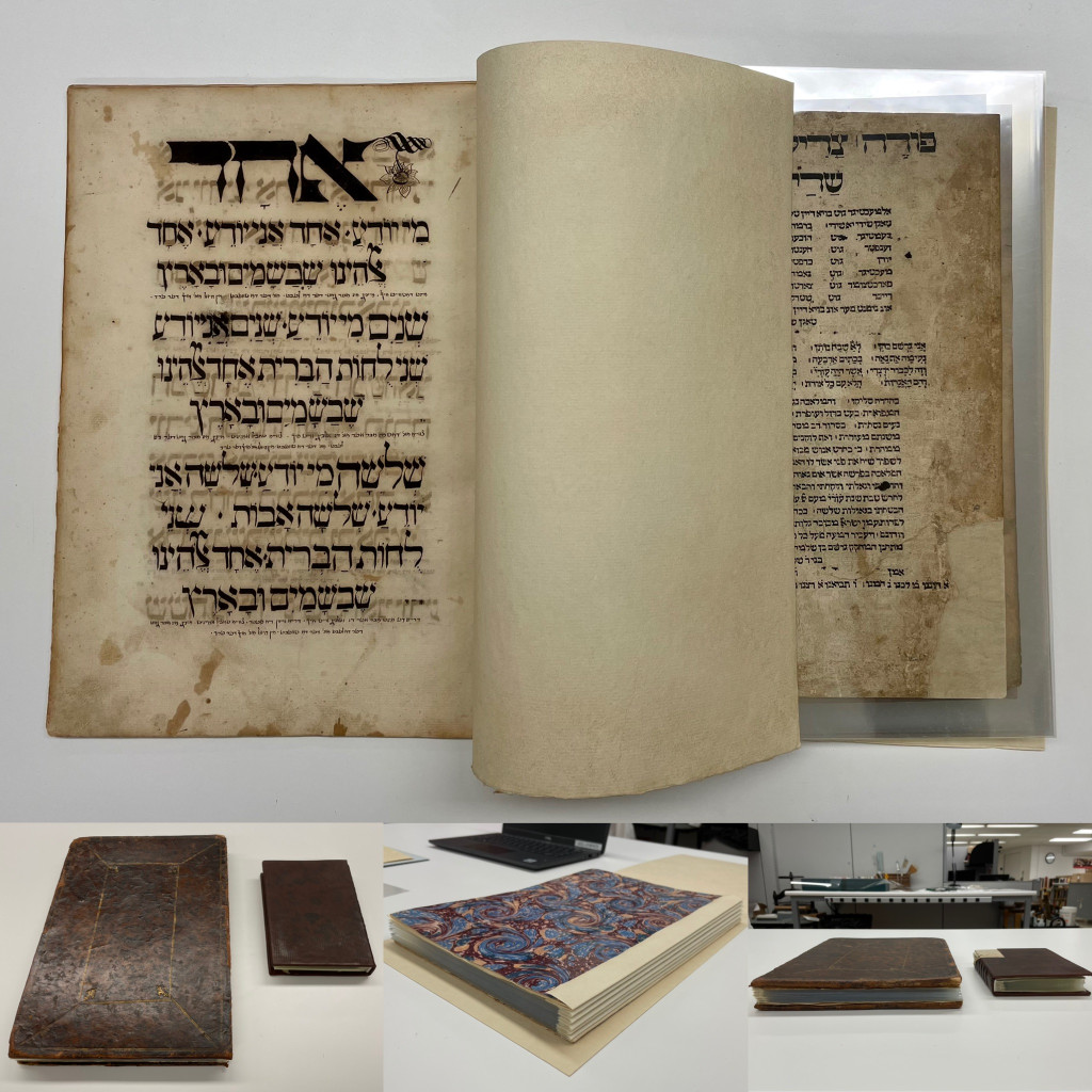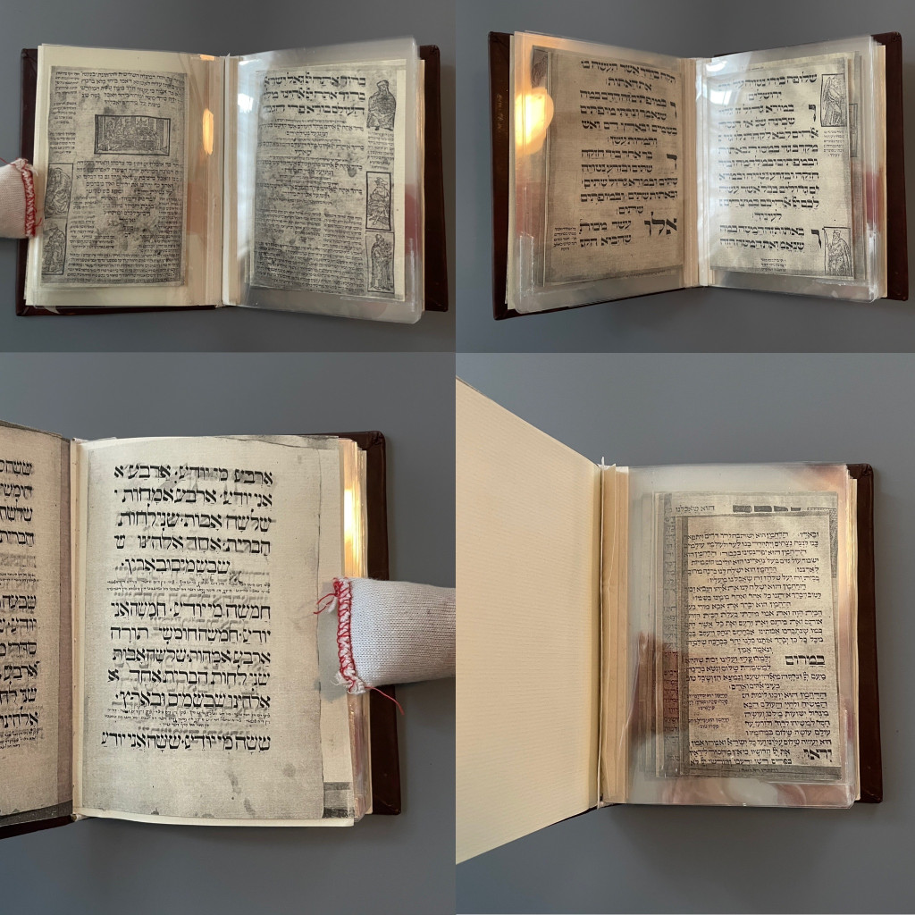 I particularly enjoy the problem solving nature of special collection treatments and thus, my “favorite” treatment is usually the one I’m working on. Currently, I’m treating a Haggadah owned by Hebrew Union College that dates to 1526 or 1527. While I’ve treated other haggadahs from HUC, including this one, this project involved iron gall ink treatment AND rebinding a textblock with two different sized leaves, or pages, into its original historic leather cover. Because the binding had been previously treated and reformatted with materials that did not age well, collaboration with the librarians at HUC required exploration into whether we wanted to re-create the past reformatting option with longer lasting materials, or perhaps, explore a new option altogether. Before we committed to a solution, I created a model to test out a new option since unanticipated questions or outcomes often arise during experimental pursuits. For that reason, it’s better to problem solve on a model, rather than on an actual special collection material. In the end, the librarians and I were happy with the results of the new option, and I’m currently at the stage where I’m ready to start rebinding the pages of the actual object.