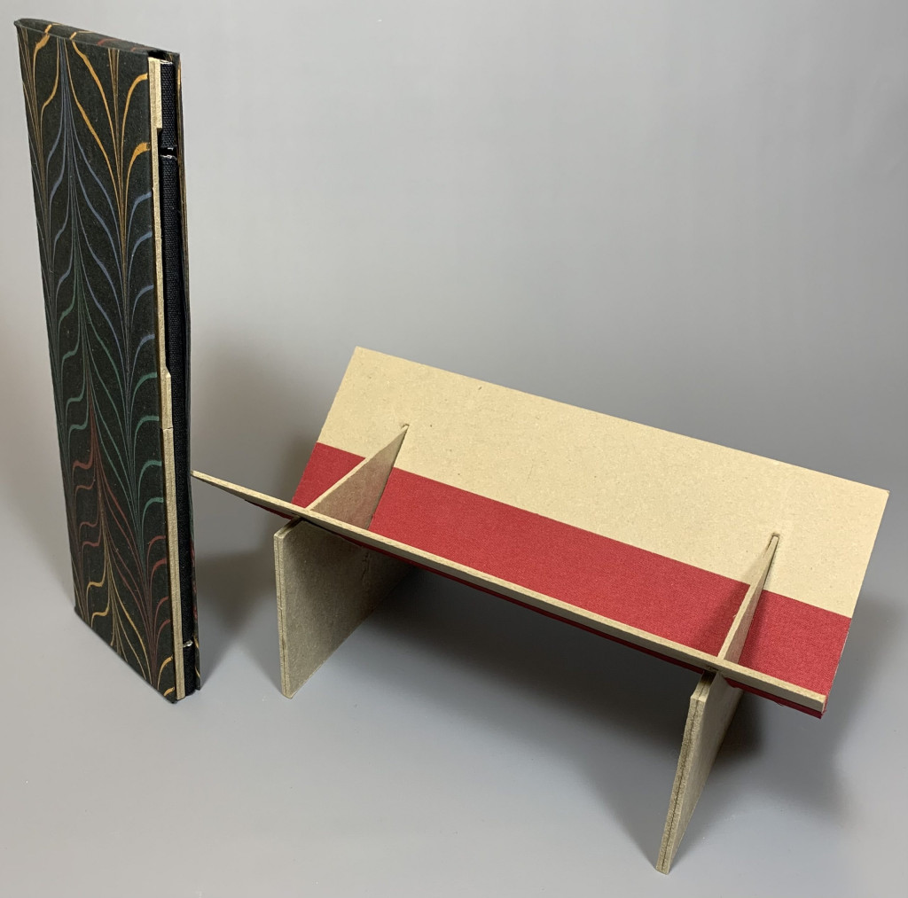 Here you can see a collapsed punching cradle stored in a paper slipcase made with marbled paper (left) and a punching cradle assembled and ready for use (right).