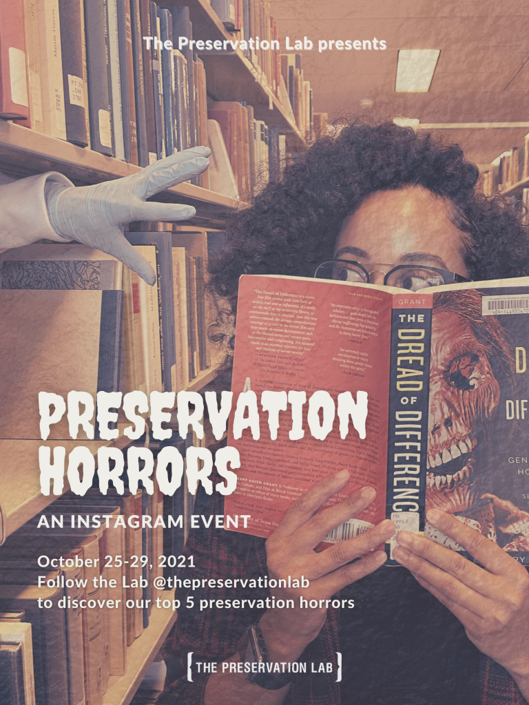 Tune into the Lab’s Instagram the entire week before Halloween, where we’ll be sharing five of the scariest “preservation horrors” that we encounter in our work. It’s bound to be a fun but frightening week that you won’t want to miss!