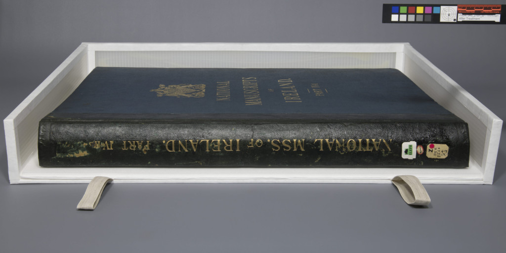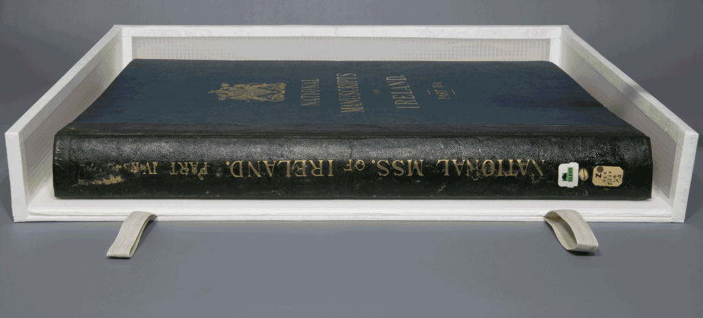 Ultimately, the book sled will allow the book, Facsimiles of National Manuscripts of Ireland, to be visible on the shelf while also aiding in transporting the book through the library when needed. It will also prevent additional damage and abrasion to the leather at the spine, which received a reback during treatment.
