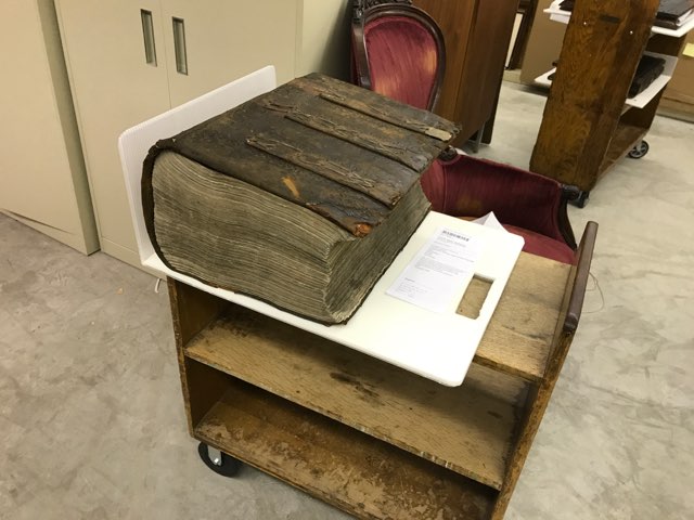 When the Lab received an elephant folio from the University of Cincinnati Classic’s Library that needed treatment and housing, we were able to create the very first book sled at our Lab! Housing a book over 20 inches tall is no easy feat, so we were thrilled to be able to use the experience and advice from our fellow conservation professionals. I worked alongside Chris Voynovich and Catarina Figueirinhas (because 3 minds are so much better than 1) where we problem solved, planned, and constructed this large book sled. The finished sled design closely follows Saclolo’s recommendations, with minor adjustments to the tray, as our book did not have bosses.