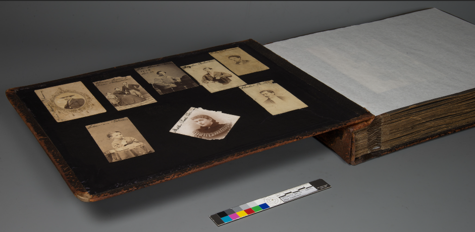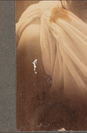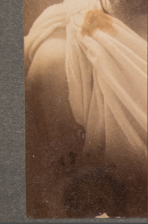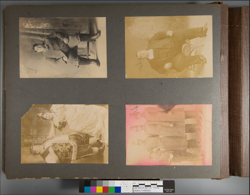 While treatment cannot be performed to recolor the images, some photographs did receive conservation treatment to improve visual legibility. There were nearly 30 images that appeared to have a dark discoloration. These photographs were identified to be missing fragments of paper backings. As a result, the dark album pages behind the photographs were obscuring the visibility of the photographic emulsion layer. Some of the more badly damaged images were carefully lifted, relined and reattached. Others received general surface cleaning. A few examples of improved readability are below.