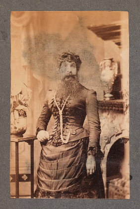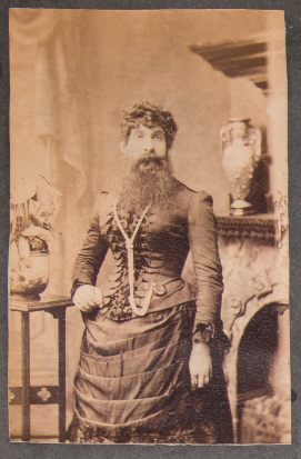 “Album of 266 photographs of varying sizes. Most are portraits of Robinson family members and of the circus staff and performers. Included are group portraits of the work crew, musicians, clowns, acrobats, novelty acts, and family acts, and circus animals. Many of the individual portraits are of side-show performers such as tattooed men, albinos, women with floor-length hair, dwarfs, etc. Some of these are studio shots that may have been sold or used as advertising. A small number have captions, and the few with dates are from 1901-1909.”