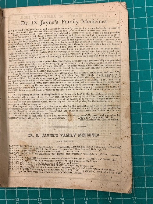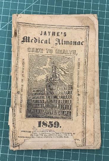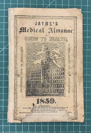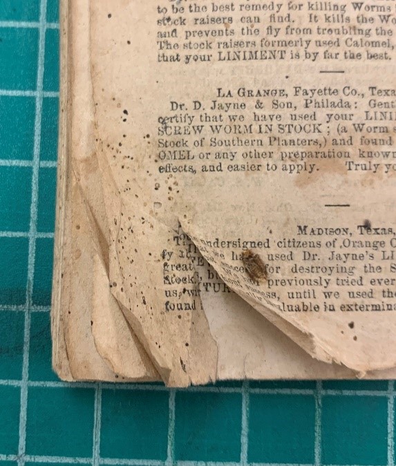 The pamphlet, part of a collection selected for digitization, first came to the lab in need of cleaning and stabilization for its upcoming photo-shoot. The small pamphlets, titled Jayne’s Medical Almanack, would have been heavily used, warranting some of the grime. However, on this one, I noticed an inordinate amount of insect frass staining on many of the pages.
