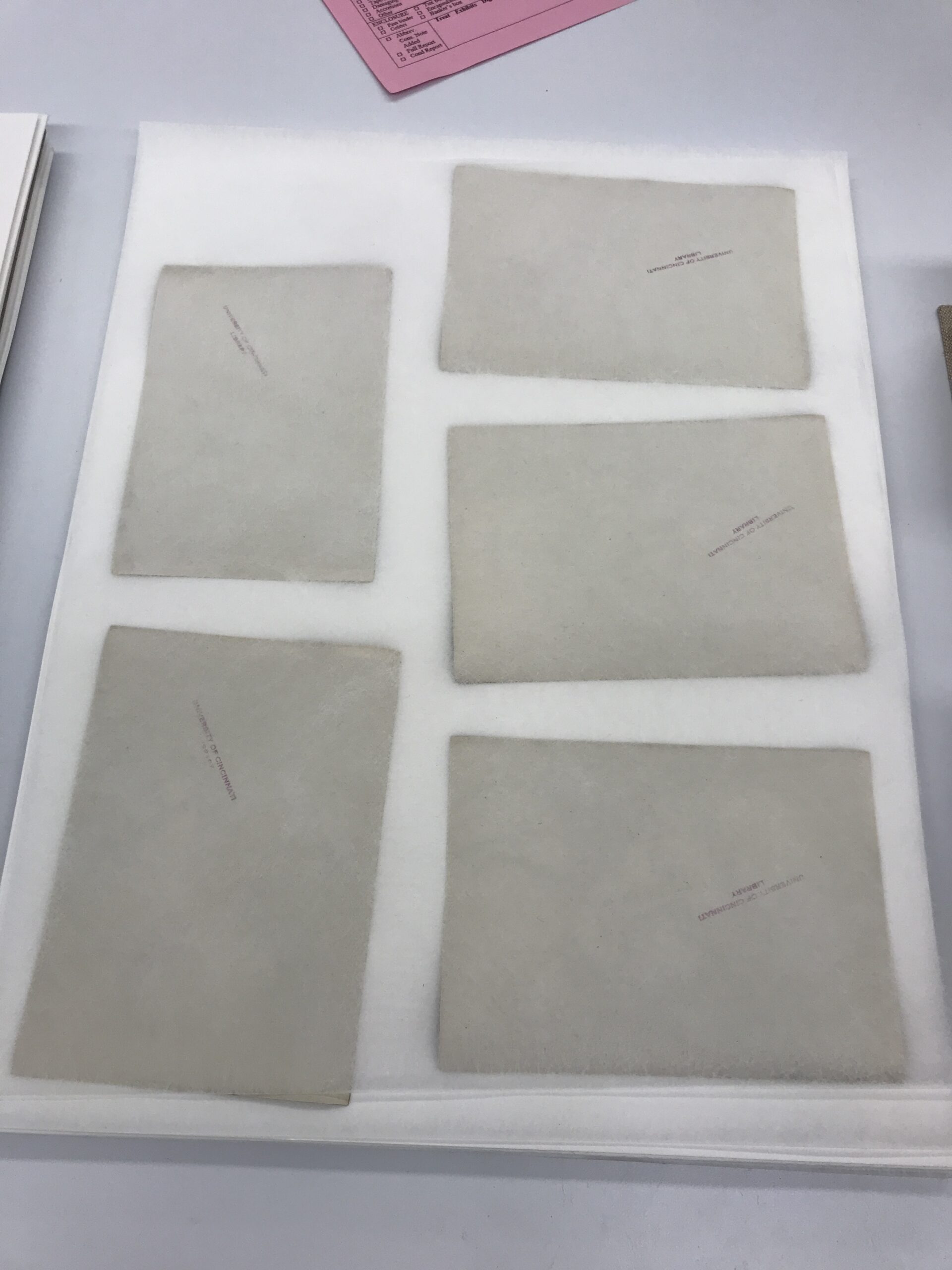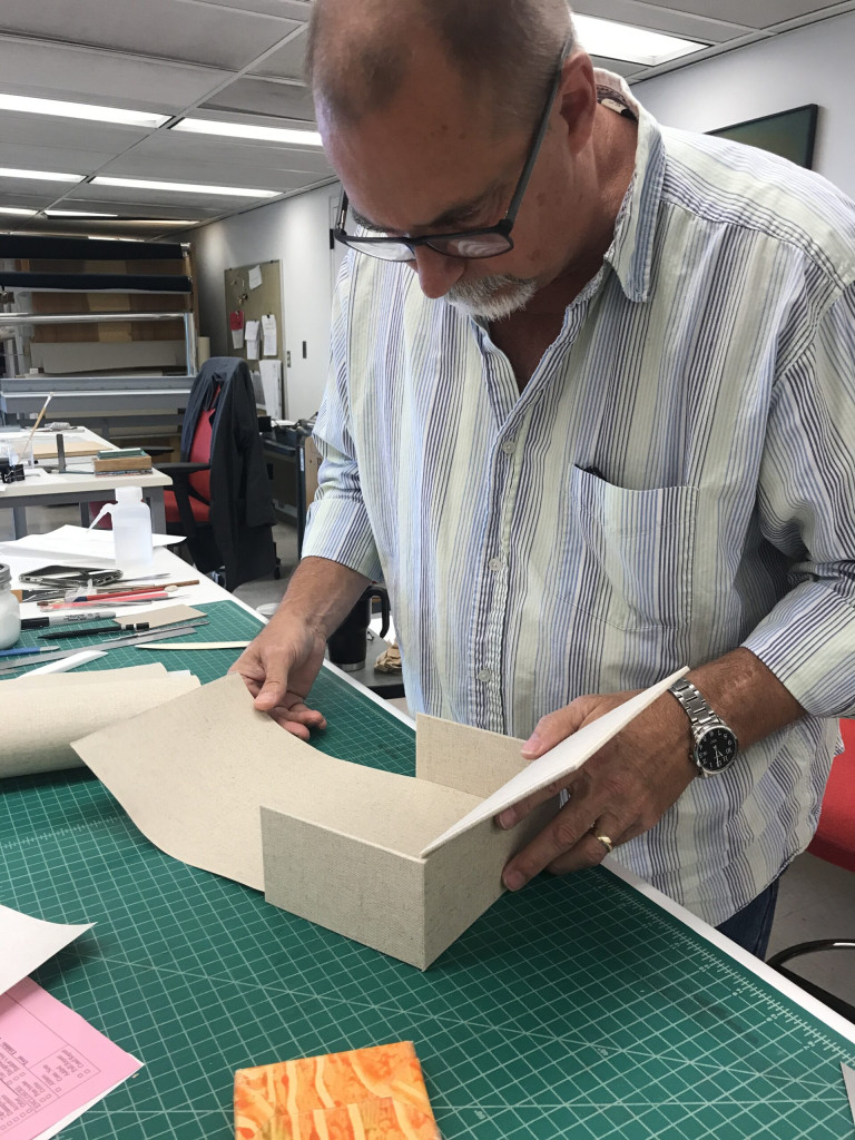 Chris is usually faster with any treatment, so his batch has been fully treated, and now he is in the process of making an enclosure, a cloth clamshell compression enclosure to ensure the photographs don’t start to curl again.