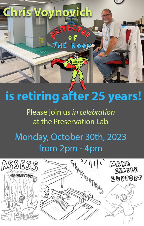 Congratulations are in order! We are happy to celebrate with our lab colleague, Chris Voynovich. After 25 years at the Public Library, Chris is retiring to a lovely beach house in Florida.