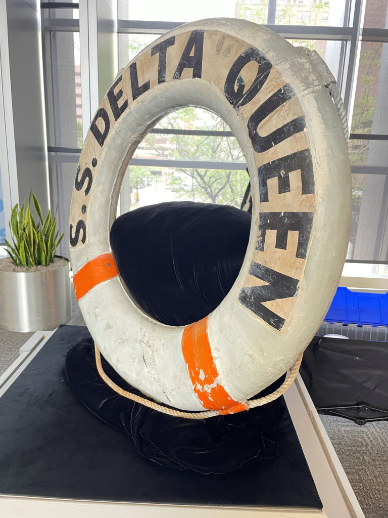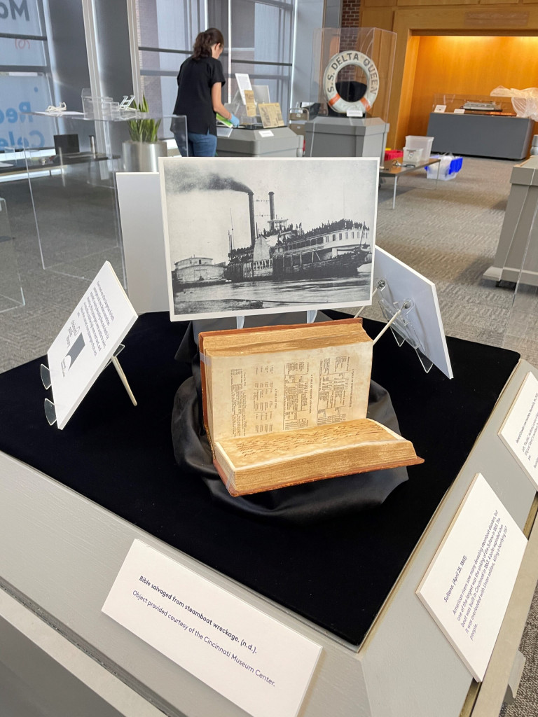 While much of the materials in the exhibit are owned by the Public Library, some of the more unique treasures are on loan from the Cincinnati Museum Center who provided items such as a heavy life preserver made of cork and a leather-bound bible with handwritten inscriptions salvaged from steamboat wreckage.