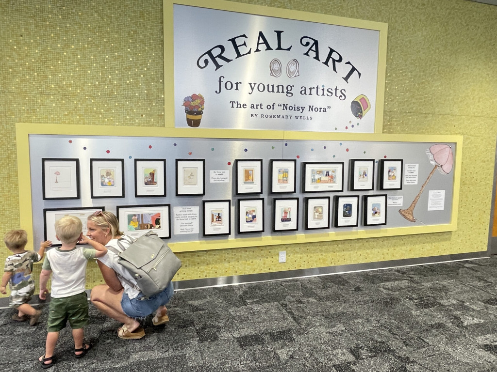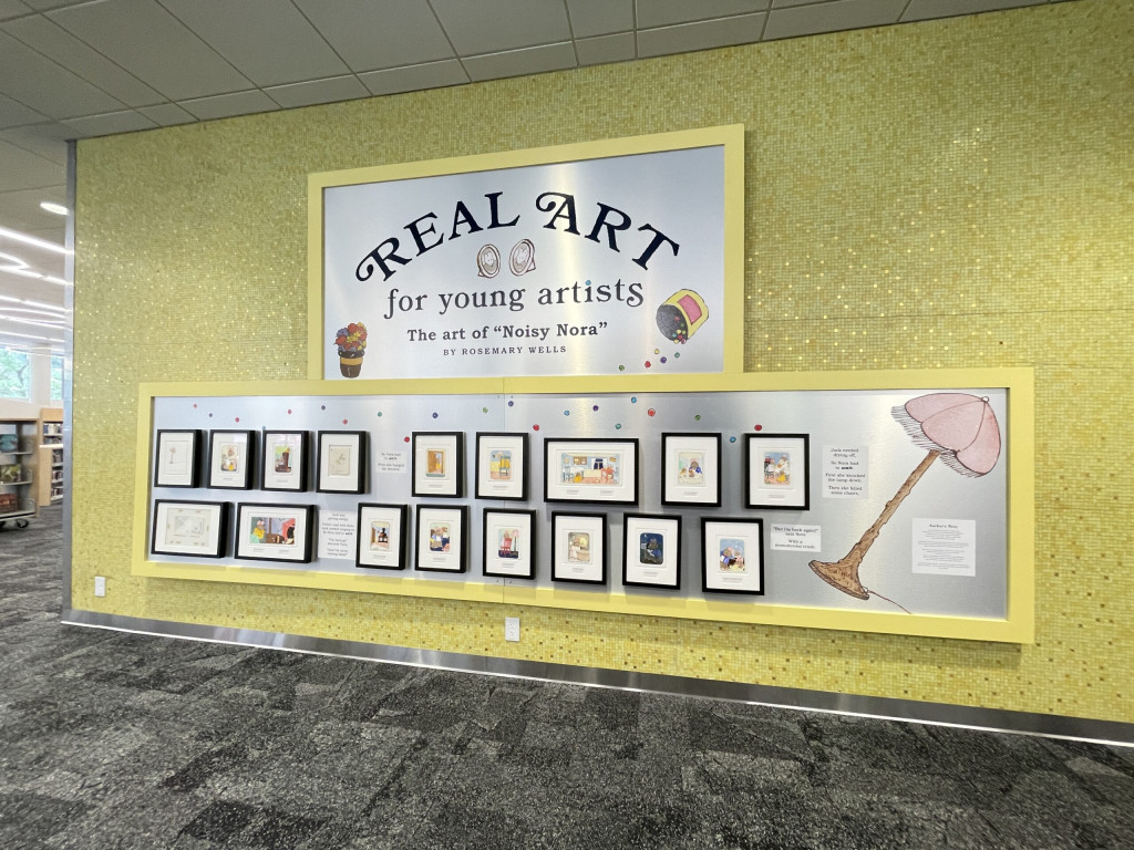 The exhibit showcases original hand-drawn illustrations created for the book Noisy Nora, donated to the library by the author and artist, Rosemary Wells.